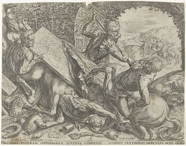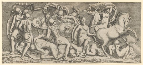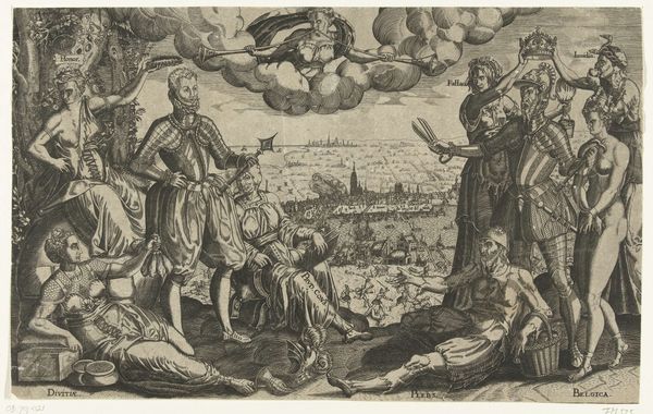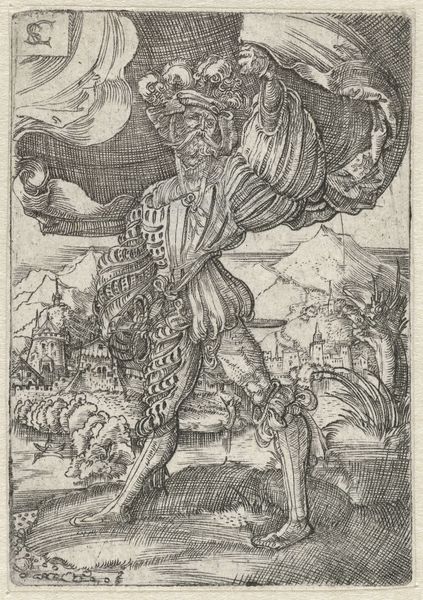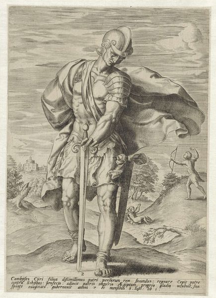 This engraving, "The Roman Empire," was created by Wierix around the late 16th century. At first glance, we're confronted with a heavily stylized composition, organized around a central, dominant figure: a Roman soldier. The soldier is flanked by scenes of conflict and conquest. The use of line is intricate, creating texture and depth in the soldier’s armor, the flowing banner, and the chaotic battle scenes in the background. Wierix uses these lines to construct a highly structured visual field, where every element contributes to a sense of order imposed on potential chaos. The engraving seems to suggest power through the rigid structure of the soldier's figure and the controlled chaos of the battle, which is contained within the frame. Yet, the image's semiotic value resides in its assertion of dominance, a visual manifestation of the Roman Empire's claim to authority. It is a carefully constructed symbol of power, designed to communicate a specific ideology through form and composition.