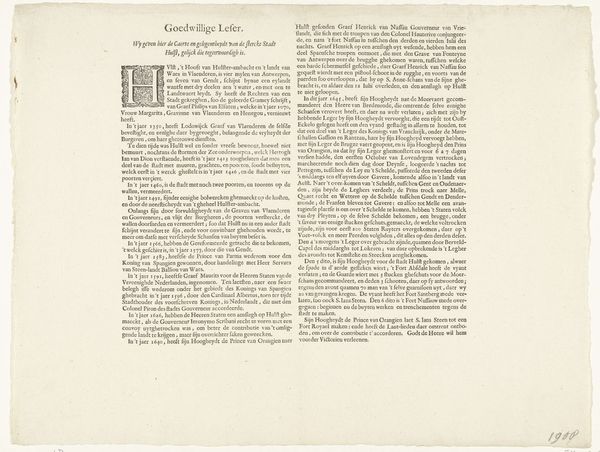 Curator: Let's consider the formal elements of "Beschrijving van de Oude Kerk te Amsterdam" from 1783. We're dealing with a print, so the texture is primarily that of paper and ink. How does the composition strike you? Editor: Well, first of all, the aged paper gives it a sort of… historical feel, doesn't it? The typography is also quite dominant. I suppose I’m drawn to how the artist presents so much detail within a structured, almost architectural, layout. What catches your eye, though? Curator: Note how the typography isn’t just informative; it's designed to guide the eye. Observe the weight and spacing of the letters, the hierarchy established between the title and body text. Consider, too, the balance between the textual elements and the blank space surrounding them. It’s about a distribution of weight and air. How would you describe the function of the initial capitals? Editor: I see what you mean about balance; there's an interesting relationship there. It is like it invites you into the text, it is clearly a design choice as well as an illustrative function. Do you think the aesthetic choices, like using older typefaces, give it any particular significance in relation to its time? Curator: Precisely. These typesettings are not merely utilitarian; they represent the artistic principles and philosophical viewpoints held towards visual communication in its own period. Look, in the 18th century, the formal qualities of a printed page carried cultural weight – reflecting ideas of order and erudition. What conclusions can you draw based on that insight? Editor: So it isn’t just information; the choices communicate how valued order and learning was at the time…I'll have to remember that. Curator: It certainly enhances one’s approach to appreciating the piece's overall effect, indeed. Editor: I will keep this in mind moving forward when thinking about 18th-century art. Thanks!