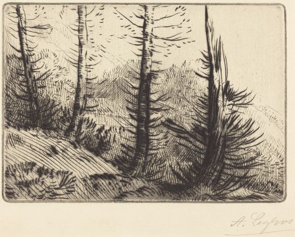 Curator: Today, we're looking at Alphonse Legros' "In the Forest of Fontainebleau," a graphite and etching piece depicting a serene forest scene. Editor: My initial reaction? The density of the lines creates an incredibly moody atmosphere. There’s a real sense of the forest closing in, perhaps even a feeling of melancholy. Curator: Indeed, Legros’ technique here is quite striking. Notice the meticulous cross-hatching and the varying line weights he employs to define the forms of the trees and the foliage. It’s all about structure, the internal logic of representation. Editor: And the social context of the forest is quite potent, isn't it? This forest as both a refuge and a place of alienation, especially in 19th-century France with all its social upheavals. Forests have long been symbolic locations. Curator: Semiotically speaking, consider the stark contrast between light and shadow. This tension creates visual interest but also alludes to underlying oppositions inherent within the scene itself. Editor: This reminds me of Foucault’s heterotopia; the forest acts as its own distinct world within a world, subject to its own rules of light and dark. It allows for subversion or reaffirmation of identities – in other words, the figure may have its being here apart from public gaze. What do you think, what is this solitary figure doing deep inside the trees? Curator: You presuppose a figure is there— the impression may arise as much through formal composition, perhaps playing out psychological interiority rather than social placement. It seems instead to operate through starkness. I would hesitate on ascribing particular motivation. Editor: Still, these quiet etchings force a kind of awareness. There is not an attempt to hide that the work has an effect, it invites introspection of ourselves, while being at the limits. Thank you! Curator: A poignant reminder of the emotional power inherent in carefully observed landscapes, and certainly invites us to view formal qualities in relation to their meaning and construction of reality.