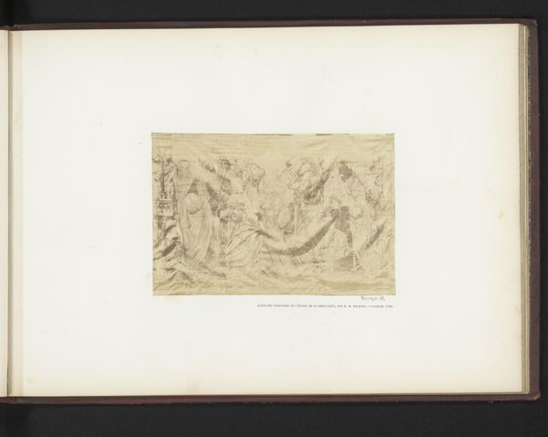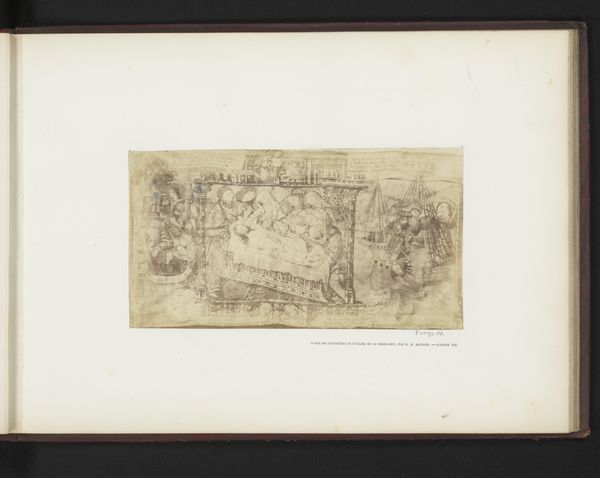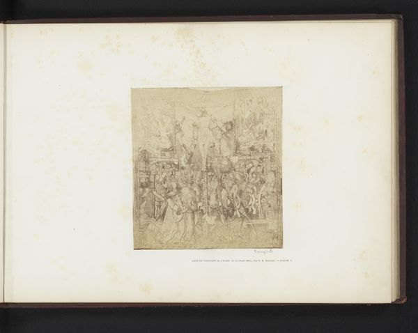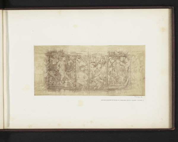 Editor: Here we have Hippolyte Malègue's "Tapestry with the Descent of the Holy Spirit and prefigurations in a church at La Chaise-Dieu", made sometime between 1868 and 1873. It seems to be a photograph of some kind, maybe an albumen print or a collotype? I am struck by the almost documentary quality, despite its religious subject matter. What's your read on this, from your perspective? Curator: From my perspective, the key here lies in understanding this work as a photographic reproduction, almost certainly intended for mass consumption. It democratizes access to this medieval tapestry in a church far from the urban centers. The choice of albumen or collotype – processes involving specific chemical and labor-intensive methods – indicates the intention to render the tapestry visible to a wider audience through reproduction. Does knowing the medium change your initial interpretation? Editor: It does! The "mass consumption" aspect you mentioned adds a whole new layer. So, instead of focusing solely on the tapestry itself, we can also consider the socioeconomic impact of reproducing and distributing it? Curator: Precisely. Think about the conditions of production. Who was involved in creating this collotype or albumen print? What was the cost of these prints, and who could afford them? It reframes our understanding; instead of high art we have accessibility thanks to these processes. The focus shifts from purely aesthetic appreciation to the social life of this photographic reproduction. Editor: So it's less about the spiritual subject and more about the act of dissemination. Were these photos generally appreciated as a form of art during that time, or mainly seen as documentary? Curator: That is part of the key tension of the time. This image complicates the existing artistic hierarchies. Was photography seen as craft, a means of replication? How was this perceived relative to "high" art forms? Or were certain examples regarded for artistry of composition? Editor: I hadn't considered it that way before! Thinking about art in terms of production and access opens up a whole new perspective for me. Thank you for that. Curator: Indeed! Paying attention to the materials and modes of production can change how we understand art's historical purpose.