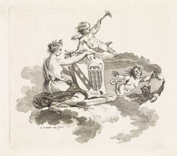 This pen and brown ink drawing by J.F. Clemens presents a preparatory sketch for a title vignette and prospectus of a map of Christiansø. The composition is neatly organized with the title text on either side of a central allegorical scene. The classical figures are rendered with delicate lines and subtle gradations of tone. The symmetrical design of the drawing creates a balanced visual field, which harmoniously blends textual and figurative elements. The allegorical figures, rendered with a neo-classical sensibility, flank the central cartouche. The linear precision and controlled wash suggest Clemens' interest in clarity and order, hallmarks of the Enlightenment. The use of classical figures evokes authority and endows the map with a sense of historical and cultural significance. The drawing may be viewed as an exploration of representation, where cartography meets allegory to communicate not only geographical data, but also ideological values. The work, therefore, serves as more than just a sketch; it’s a structured statement about knowledge, power and visual communication.