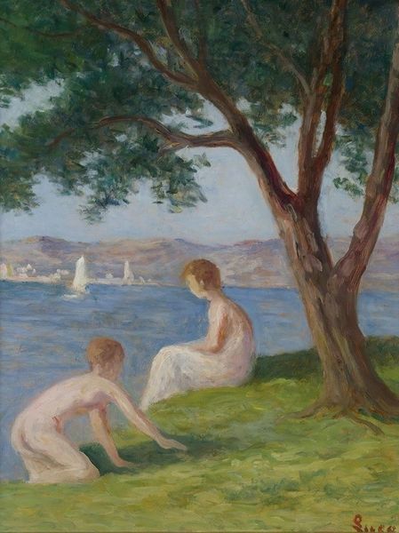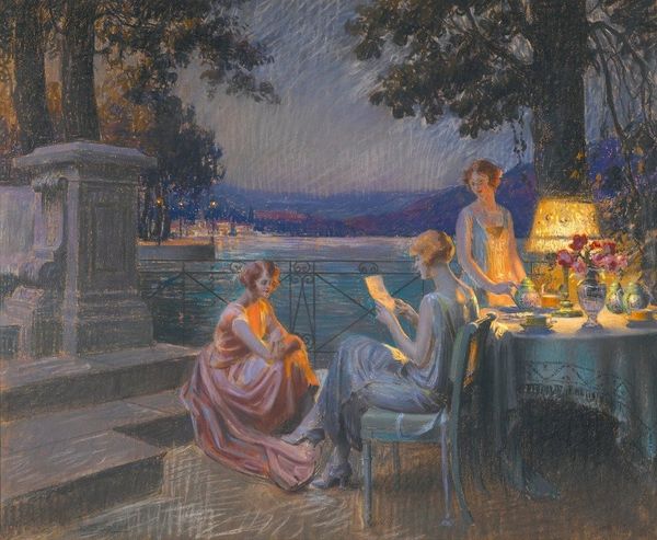 Curator: Georgina de Albuquerque painted "Canto Do Rio" in 1926. Editor: Oh, how dreamy! It's got that hazy, sun-drenched afternoon vibe. Like a postcard from a forgotten summer, wouldn’t you say? Curator: Albuquerque's work often reflected the changing social landscape of Brazil, moving between academic traditions and embracing elements of modernism. One of the most notable roles she undertook was to paint significant historical and mythological events. She also modernized teaching methods as director for the National School of Fine Arts. This piece feels intimate and different, though. Editor: It really does. You can almost feel the heat rising off the canvas. The colors are so muted, it’s as if the painting itself is sighing with contentment. I wonder, were those friends of hers? A spontaneous scene or arranged with models to highlight society in the era. The tilt of their heads feels so human and knowing, like a secret shared under the Rio sun. Curator: Considering it was painted in 1926, just after the "Semana de Arte Moderna" which really propelled modern art forward in Brazil, one can definitely see a blend of influences. It is said her husband Lucílio de Albuquerque encouraged her to embrace modernity as a young painter. The scene speaks to the culture of leisure that the upper classes adopted at the time. Note that there is a Sugarloaf Mountain in the background! The composition invites viewers to participate in this peaceful setting and connect to Brazil through their experience with this artwork. Editor: Definitely. What intrigues me, too, is the deliberate softness around the edges. The scene blends into itself; less about sharp realism, more about feeling. You can’t quite grasp every detail, and perhaps that’s the point, no? Some things are meant to remain gently out of reach. Curator: Precisely. That focus aligns the piece with larger conversations about national identity being explored through landscape painting and everyday moments. And the figures become stand-ins for aspirations. Editor: I see what you mean. Well, whatever it all means, it makes me want to pack a bag and chase the Brazilian sunlight. Curator: Agreed. The power of art lies in those moments of connection.