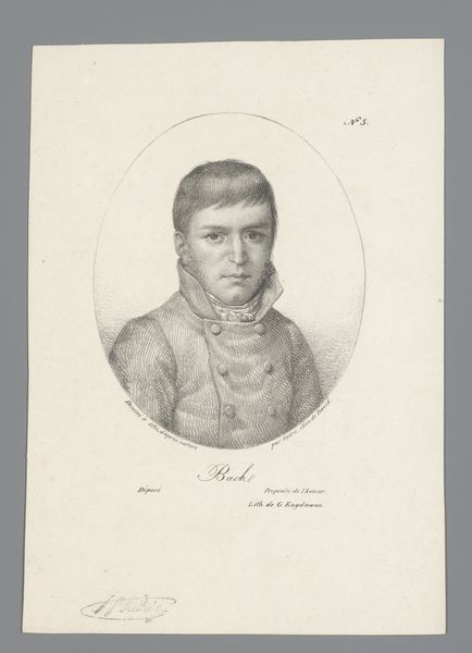 Editor: Here we have Jean Pierre Sudre’s 1818 graphite drawing, "Portret van Jean-Baptiste Collard," at the Rijksmuseum. What I notice first is how… earnest he looks. There's such formality in his expression, in the stark black and white. What stands out to you? Curator: The oval frame and clean lines signal Neoclassicism, calling back to ancient virtues. What meaning was attached to such stylistic restraint, do you think, during the upheavals following the French Revolution? It is fascinating how visual languages are resurrected and given renewed significance. Editor: So the Neoclassical style suggests stability, even aspiration, in a period of big social changes? But the man himself…his expression feels almost…modern in its simplicity. Curator: Precisely. The sharp graphite lines provide a raw honesty, contrasting against the idealized Neoclassical style. How does this contrast impact our perception of Collard? Editor: It makes him more relatable, somehow. Less a symbol, more a person, gazing at you. Curator: And who was he, this Collard? Does the portrait provide clues? Perhaps the clothes? It is intriguing how sitters’ portrayal shapes the audience’s understanding of identity and social roles through a deliberate set of visual codes. Editor: Good question. The buttoned coat implies someone respectable, bourgeois maybe? Curator: Exactly! Notice, too, how the overall composition pulls from Roman portraiture - perhaps he's striving for an elevated status. The choice of visual symbolism constructs powerful cultural associations and meanings around this image. Editor: I see! It’s interesting to think about the language of portraiture – a real blend of individual and type. Thank you for unpacking this portrait. Curator: Indeed, portraits always tell multiple stories.