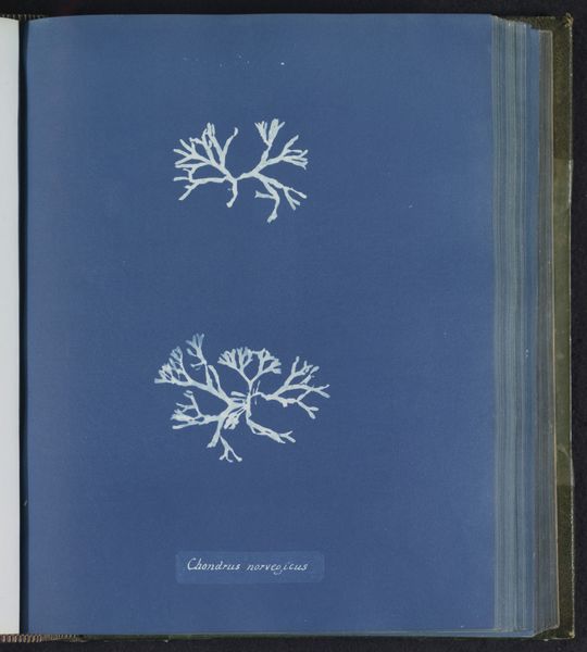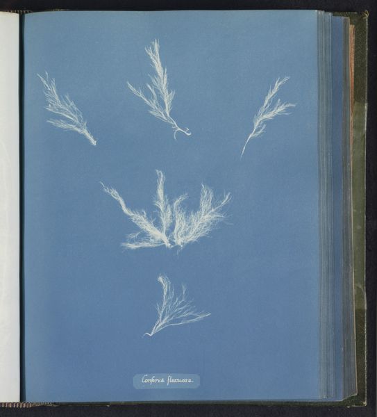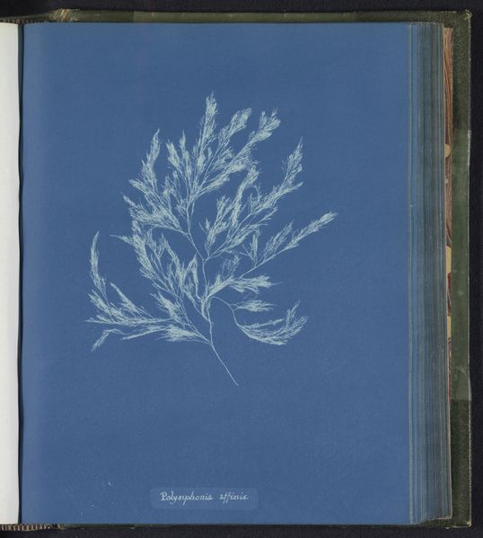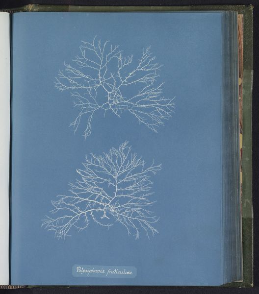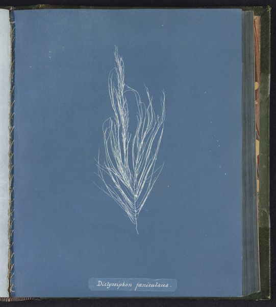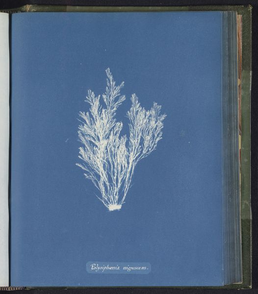 Editor: This is "Dichloria viridis," a cyanotype by Anna Atkins, created sometime between 1843 and 1853. The stark white rendering of the algae against the deep blue paper is so striking! What catches your eye about this work? Curator: The work exemplifies the beauty found in precision and clarity. Atkins meticulously captures the structural essence of the algae. Notice how the cyanotype process, with its stark contrast, emphasizes the delicate branching and linear forms. Editor: It's interesting how the process itself becomes a defining characteristic. Does that limited palette direct our focus in any way? Curator: Indeed. The monochrome forces us to consider the interplay of positive and negative space. The way the white form emerges from the blue ground is quite arresting, almost diagrammatic, wouldn’t you agree? Furthermore, consider the texture created. It is more than representational; it is material and indexical. The work's flatness further enhances the experience. Editor: Absolutely, the texture is fascinating. Almost like a ghostly blueprint of the algae. What’s most compelling to you, when viewing the piece? Curator: The emphasis on form over representational color truly allows for contemplation on nature’s inherent design. Editor: I see that now! It is very thought-provoking, especially viewing something so methodically created and presented as a work of art. Curator: Yes, the merging of science and art encourages one to reconsider our preconceptions about art making in that time.