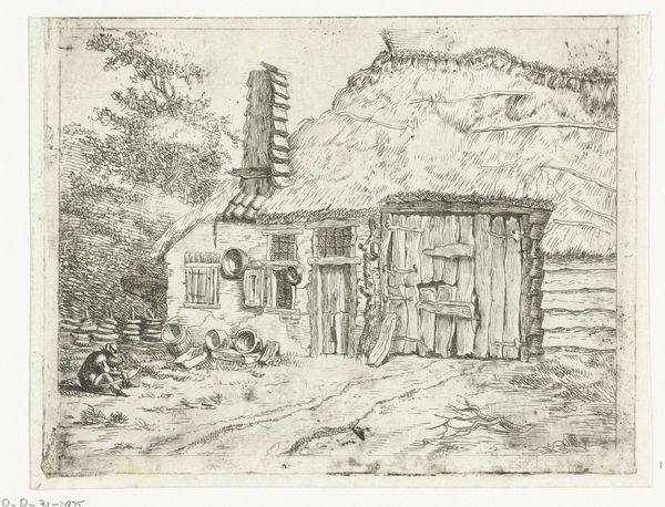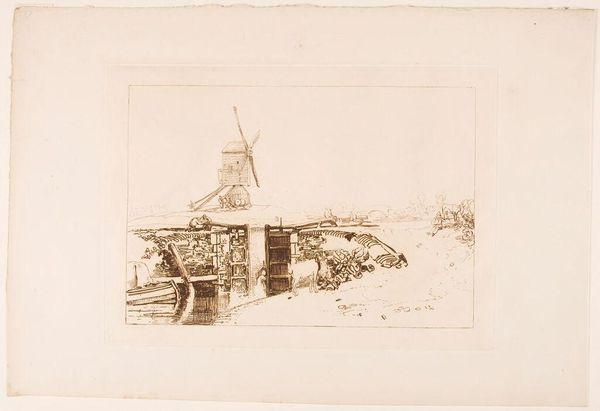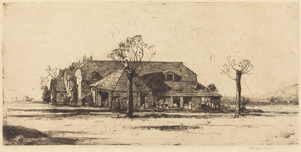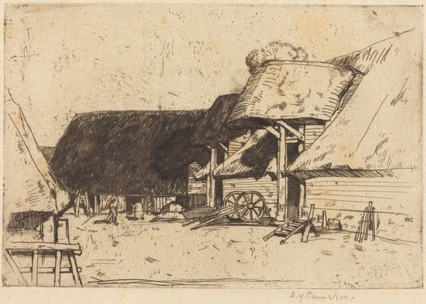Editor: Muirhead Bone, ladies and gentlemen, capturing a seemingly unremarkable corner of Cambridge, a spot known as Moore's Yard, back in 1903. What springs to your mind gazing upon this etching? Curator: It has an interesting, almost theatrical sense of light and shadow, doesn't it? As if a stage play is about to begin. The lines, thin yet insistent, describe a world on the cusp of monumental change. Editor: Yes, theatrical is spot-on! I see the weary horse standing patiently as the old stagehands-- are they grooms or stablehands or players?-- prepare the carriage in the shadowed depths. There is this sense of stillness, a breath held. The everyday elevated to something more... symbolic. Curator: Exactly. Look at how Bone employs etching, a medium that privileges line and detail, to frame a rather mundane scene as though it were of critical societal importance. The carriages are more than vehicles; they represent an era, status, and transit on the brink of being superseded. Editor: You are reminding me that Horse-drawn transport was starting to give way to motorcars at this point! This etching, in that respect, can almost be interpreted as a eulogy or an elegy for that older era. But let's look at the human element again – tiny figures swallowed by the structures that define their working lives. Curator: Yes, those small figures are deliberately situated at a specific moment in time, underscoring their roles within Cambridge's economic and societal infrastructure. We are not looking at just any horses, but the transportation network upon which Cambridge depended at the time. Editor: And to do so through such subtle light, which hints that these spaces of work are so fragile! Curator: Indeed. This etching gives viewers much more than mere picturesque charm; Bone provided visual fodder for deeper thoughts concerning shifting dynamics occurring at the beginning of the 20th century. It prompts inquiry regarding place and inhabitants. Editor: Beautifully said. Looking at Moore's Yard, a world of memory and transience hangs between these delicate lines. Curator: The socio-economic history of early 20th century Cambridge hangs also suspended on that thin copper plate. Thank you, Bone.