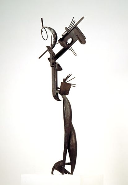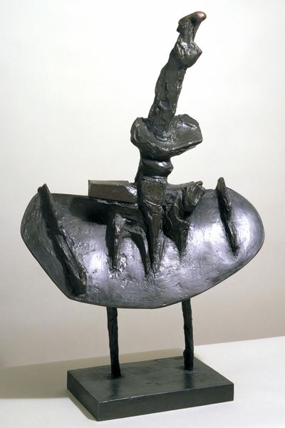 Editor: So, here's Reg Butler's "Circe Head," a bronze sculpture at the Tate. It’s… unsettling. The pins sticking out, the rough texture... It feels both ancient and futuristic. What socio-political commentary might Butler be making here? Curator: Well, Butler was working in a post-war context, deeply affected by the atrocities he witnessed. These spiky protrusions, the fragmented head – could these reflect the psychological fragmentation of individuals in the wake of violence and trauma? Does this sculpture evoke feelings of powerlessness? Editor: It definitely does. It's like a monument to brokenness. I see what you mean about the post-war context influencing this. It makes me think about how art can be a reflection of societal anxieties. Curator: Precisely. And how our understanding of art evolves with our own historical perspective. Editor: That's fascinating; I'll definitely look at Butler's work in a different light now.