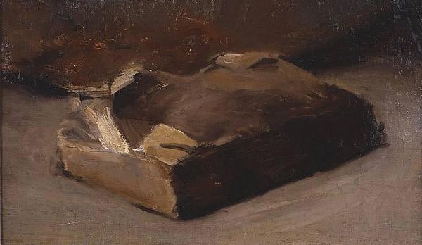 Curator: Lucian Freud's 1992 painting, "Still-Life with a Book," crafted in his signature thick oil paint style. What strikes you most immediately? Editor: The overall drabness and muted color scheme evoke a somber, contemplative mood. Everything looks so… heavy. What is that weighty-looking mass next to the book? Curator: The…weighty mass…seems to be an amorphous piece of fabric or maybe even just a discarded rag, carelessly tossed aside. It is a stark contrast to the formal connotations that a still life painting of books usually offers. Freud seems determined to highlight the materiality and sheer physical bulk of the elements in a blunt, almost crude manner. Editor: Exactly! And it reminds me of the historical context of such discarded objects in post-war economies: it almost reads as an aesthetic decision deeply linked to economic austerity and its impact on artistic production and consumption of materials. Think about his subjects: Freud consistently engaged with bodies marked by lived experience, both physically and psychologically. Does this interest in the object tell a similar story? Curator: Indeed! The book, or the representation of books within the painting, presents an interesting point. Notice how he deliberately emphasizes its materiality and weight, almost to the point where its presence disrupts the visual comfort expected in conventional representations. I mean, the oil paint itself is laid on so thick and palpably, drawing your attention to his deliberate action, rather than some pre-ordained representation of literacy, power, or enlightenment associated with "the book." It also draws attention to the artist as laborer. Editor: But is there some element of subversion here as well? Still-life as a genre has traditionally excluded representations of everyday existence and experiences; by showing this, does Freud reveal an intentional and rebellious artistic action aimed at elevating commonplace realities through these objects, like his other figurative works of humans, which are rarely perfect, always lived? Curator: Perhaps! The thick application embodies both defiance towards established artistic norms but also speaks volumes of Freud’s engagement with, and understanding of, the medium. It feels brutally honest. Editor: It invites a dialogue between those historical traditions that are being contested here within this depiction, doesn’t it? Thanks, it gives a great insight into understanding how the mundane tells profound and challenging stories of everyday life.