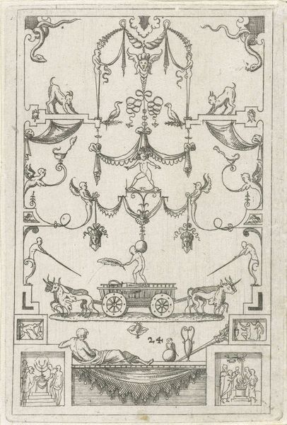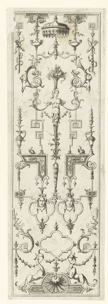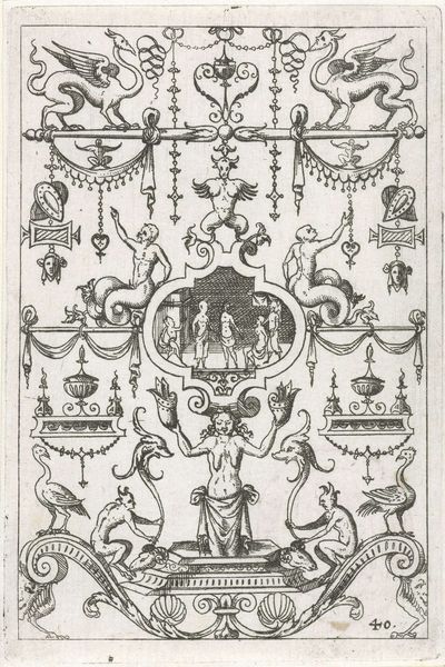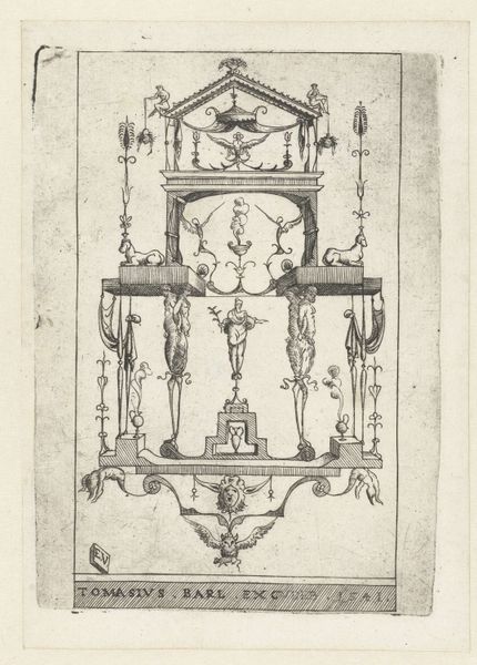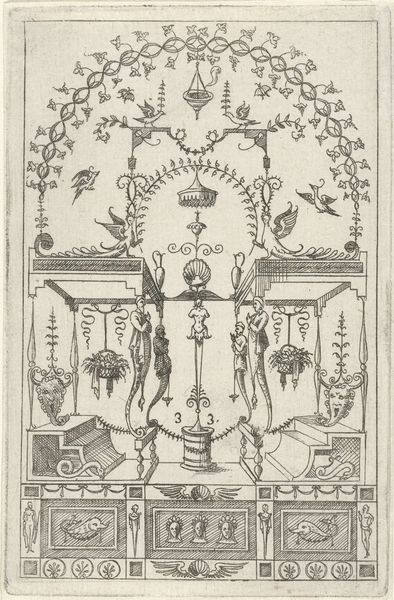 Curator: Looking at this, my first thought is, what an ornate, fascinating little universe! The eye just dances all over. Editor: Indeed! This drawing, titled "Op een voetstuk, gedecoreerd met van links naar rechts Mercurius, Neptunus en Venus, staan hermen" is by Hans Sibmacher, made somewhere between 1525 and 1594, utilizing pen and ink. Curator: Right, a classic period piece. Immediately, I’m struck by its symmetry, and how all these elements feel delicately balanced, or attempting to be, like a social hierarchy made visual. Editor: Exactly! The classical allusions—Mercurius, Venus, Neptunus—lend themselves to themes of communication, love, and dominion. Considering Renaissance humanism, it positions humanity at the center. Curator: All very...phallic, I notice. And I wonder about their representation here, so rigidly placed. How might we unpack these representations through a feminist lens? Editor: An interesting interpretation! Certainly, power and gender dynamics come into play. The arrangement might be read as the subjugation, or at least the ordering, of these figures, within a very male-dominated system of representation. Curator: But the playful quality saves it. The serpentine details at the top, the little scenes underneath - it feels alive, not merely didactic. Editor: I agree! Sibmacher's creation presents such detailed intricacy. The symbolic weight layered with a lightness of touch... What resonates most with me, personally, is how it demonstrates the artist’s imaginative flair! Curator: Yes! So much of understanding art from past eras means interrogating how these societal structures informed artistic output, not only acknowledging historical contexts but also questioning their impact and perpetuation within artworks themselves. Editor: And that is, perhaps, the most remarkable takeaway of all: recognizing how art continues its conversation across time. Thank you for your invaluable comments. Curator: A great point, it was nice discussing it with you. Thank you.