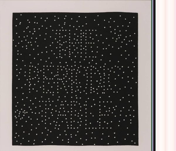 Curator: Vija Celmins' print, "Dark Galaxy," captures the vastness of the night sky in a small format. It's incredibly serene. Editor: My first thought is of the symbolic weight of stars – how cultures across time have used them to navigate, to tell stories, to project hopes and fears. Curator: Absolutely. And in Celmins' work, the reproduction of existing imagery—photographs of the night sky—speaks to questions of representation. Who gets to depict the cosmos and how? Editor: The contrast of light and dark, seen throughout history, symbolizes opposing forces. Here, perhaps, knowledge versus the unknown, humanity versus the cosmos. Curator: That contrast is also a reflection of the artist’s choices: the labor and artistic decisions made to mimic a photographic image, which raise important questions about artistic labor. Editor: Looking closely, the individual stars become less distinct, dissolving into an ocean of light. It's a reminder that even the brightest stars are part of something greater. Curator: Indeed. Celmins' work invites us to grapple with the limitations and possibilities inherent in depicting these larger systems of power. Editor: "Dark Galaxy" pulls us into a cosmic dance of symbols. Curator: Yes, it's a study in perception and power.