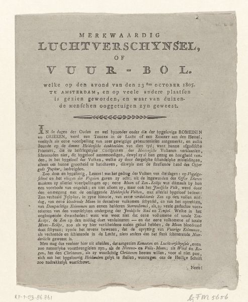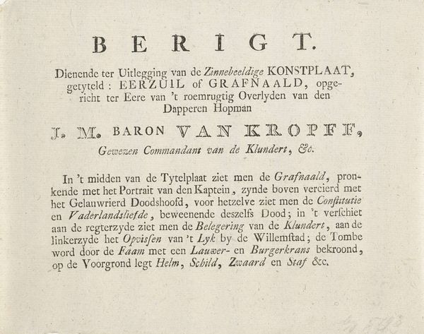 Editor: Here we have "Raadselspel," or "Riddle Game," a print from around 1765 by Willem Breebaart. The print consists entirely of text; it has an almost instructional quality. What stands out to you when you look at this work? Curator: It's fascinating how typography becomes the art here. Looking at this piece, I immediately think about the democratisation of knowledge in the 18th century and the rise of literacy. Who had access to these ‘riddle games,’ and what social function did they serve? Was it a tool for education, or just leisure, and how does that affect our understanding of art? Editor: So, the function of art could be shaped by something as basic as who can read? Curator: Exactly. The piece is more than just text; it embodies the societal values around knowledge and leisure during the Enlightenment. Furthermore, consider the distribution of this work. Breebaart wasn't just printing; he was selling "at the bookstore on the New Street," suggesting the print circulated in specific, probably bourgeois, social circles. How might the game itself reflect or reinforce those social dynamics? Editor: So, understanding the audience gives context to the artist's intentions? Curator: Precisely. Understanding the layers of access, participation, and social dynamics helps us decode its cultural value. Perhaps it was a harmless parlour game, or perhaps, in its own way, a challenge to contemporary ways of thinking and societal values. How does this affect how we approach other works of this period? Editor: This gives me a lot to think about when considering not only the object but its relationship to its moment in history! Curator: Indeed. It encourages us to question and explore the broader social narratives surrounding artworks.