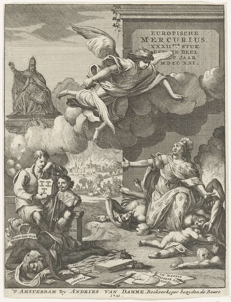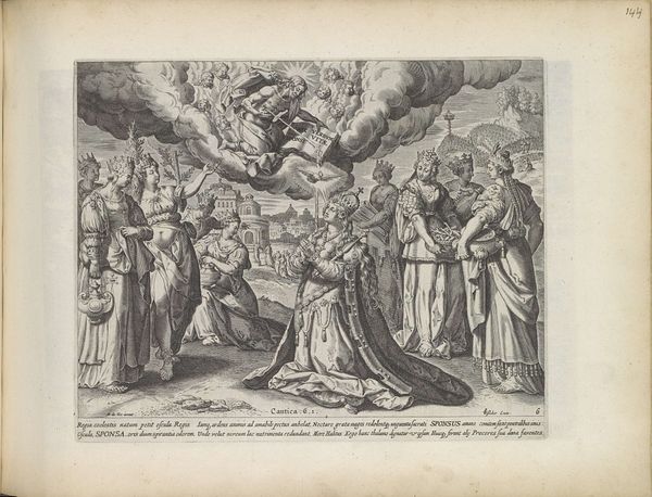 Editor: This engraving, "Christ Gives His Blood to His Bride," made in 1590 by Johann Sadeler I and housed in the Rijksmuseum, presents such a grand, almost theatrical scene. It’s fascinating, with God hovering above, showering the bride in some sort of essence. How do you interpret this work, considering its time and place? Curator: Considering this print through a historical lens, we see a complex interplay of religious and socio-political forces at play. The image of Christ offering his blood to the bride is a classic allegorical representation of the Church, deeply rooted in Catholic theology of the late 16th century. The print likely served a propagandistic function, bolstering the Church's authority during a time of religious upheaval and reform. What do you notice about the other female figures in the composition? Editor: They look like various queens or allegorical figures holding attributes; one is pointing at God and another offers…fish? It's almost like they're witnessing or participating in the sacrament. Curator: Precisely. This gathering is not simply devotional. It reinforces the public image of the Church as a divinely sanctioned institution, supported by earthly powers. The elaborate clothing, symbolic gestures, and inclusion of different figures all function to emphasize the Church's universal authority. Now, how might a public, viewing this piece in 1590, understand its intended message? Editor: I think seeing such a lavish, organized vision of divine authority might reaffirm their faith in the face of the Reformation’s criticisms. It’s interesting how art acts as a kind of visual argument. Curator: Exactly. The very *publicness* of prints like these, their dissemination through various social channels, illustrates art's capacity to engage with cultural discourse, solidifying social identities and even shaping public policy. It’s really amazing, isn't it? Editor: Absolutely! I never considered prints as instruments of power, but looking at it now, it makes total sense!