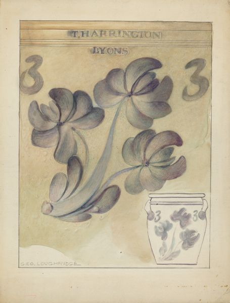 Curator: Looking at this watercolor drawing entitled "Churn," made around 1937 by Charles Caseau, I'm struck by its whimsical, almost dreamy quality. Editor: Yes, it's quite soothing. The blue monochrome palette against the warm paper gives it an antique feel. The floral motif feels both familiar and a little... folksy? Curator: That’s an apt description. Folk art, and decorative art, are definitely touchstones here. Caseau seems to be referencing the painted decoration found on traditional butter churns and other utilitarian objects of the period. The style nods to a revival of interest in early American crafts happening in the 30's. Editor: The repetition of these somewhat stylized flower and leaf patterns definitely speaks to a decorative impulse. I see this same imagery showing up over and over throughout folk art traditions – almost archetypal forms blooming again and again. Curator: Indeed. These motifs would have held very specific connotations for the rural communities, markers of both identity and a connection to the land during a time of immense upheaval. The rise of industrial production was threatening traditional ways of life, so art, like this, becomes a statement of values. Editor: Right, these emblems act as visual anchors linking individuals to a collective memory of self-sufficiency and craft, not to mention a time before rampant consumerism. Is the churn shape a recurring image itself? Curator: Yes, that little sketch, alongside the lettering “J. Fisher & Co. Lyons, N.Y.” tells us this is not only about any churn, but one churn maker in particular. Perhaps a shop drawing intended to show possible designs. Editor: The presence of those labels transform this from just a pretty watercolor to something of a company statement and archive document. It offers such a rare window into the artistic tastes embedded within the economic structure of a small, early 20th-century business. Fascinating! Curator: I agree! Seeing Caseau’s design, we begin to see art’s role woven into everyday production, and understand that every object has its own complex cultural history. Editor: I see more than just the product. These abstracted forms speak about deeper symbols rooted in rural society. It adds even more resonance when you consider Caseau might be evoking a collective nostalgia and history through the image on the churn. Curator: Ultimately this humble drawing, brought into the gallery context, encourages to appreciate that decorative impulse within folk objects, and connect it to broader stories of art and identity.