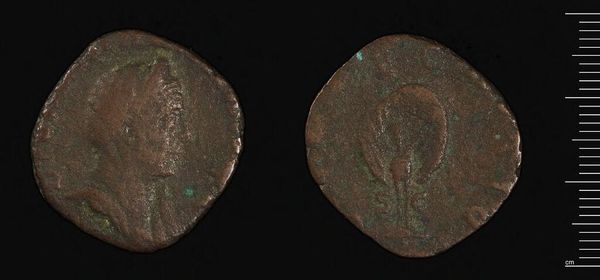Curator: This is a Dupondius, a Roman coin, bearing the likeness of Emperor Commodus. Editor: It's strikingly patinated, a heavy green veil obscures much of the original detail, giving it a ghostly quality. Curator: The coin itself becomes a symbol, doesn't it? A physical manifestation of imperial power, circulated and held, connecting the emperor to the everyday lives of his subjects. Editor: And yet the image is worn, almost illegible. The relief is flattened; the form has degraded. The sharp lines originally defining the emperor's features are blurred. Curator: It speaks to the ephemeral nature of power, the decay of empire. Even a symbol meant to project strength crumbles over time. This piece weighs 9.89 grams and resides at the Harvard Art Museums. Editor: The coin's circular form, typically associated with wholeness and continuity, is disrupted by the surface degradation and damage; the message is obscured. Curator: Perhaps the obscuring is the message. Editor: Yes, a fitting, and somewhat disheartening, conclusion.