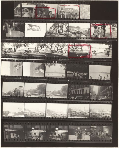 Robert Frank made this gelatin silver print, Guggenheim 313--Arkansas. The artwork consists of a contact sheet densely packed with small frames from a roll of film. This layout emphasizes repetition and sequence, typical of Frank’s documentary approach. The composition highlights the grid-like structure and the materiality of film as a medium. The photographs are small, grainy, and raw, offering glimpses into everyday scenes. Frank's choice of the contact sheet as a final piece destabilizes traditional notions of photographic perfection. Instead, it emphasizes process and documentation. The images are marked with red circles and lines, likely indicating selections or notes. The marks invite viewers to consider Frank’s editing process and his subjective choices. The sequence and the deliberate imperfections challenge fixed meanings, suggesting that the truth lies not in individual images but in the fragmented, cumulative effect of the whole. It's a powerful commentary on representation, questioning the photographer's role in shaping meaning.