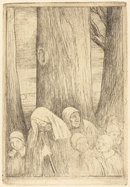 Editor: Here we have "Thunder (Un coup de foudre)," an etching by Alphonse Legros. The stark contrast between the fleeing figure and the menacing trees definitely evokes a sense of drama. What do you see in this piece from a materialist perspective? Curator: Well, it is important to consider the labour involved in etching as a process: from preparing the metal plate to applying the acid, each step depends on artisanal skills that challenge the idea of the artist as an individual genius. The choice of etching, instead of, say, painting, is telling: it is a medium more easily reproducible and accessible. Editor: So you're suggesting that the *means* of production are essential to understanding its artistic intention? Curator: Precisely. Legros would have been keenly aware of the social implications of his chosen medium. Etching allowed him to engage with a broader audience beyond the elite, marking a shift towards democratizing art consumption. Editor: Interesting! I never thought about the socio-economic aspect of choosing a particular medium. I was so focused on the image itself and the story it tells! Curator: The story is still important. But by analyzing the "how," we can delve deeper into the artist's intention and the piece's cultural relevance. For example, consider the accessibility of printmaking materials and knowledge in Legros's time. Who had access to the materials to produce art? What was the consumption practice around prints versus other kinds of art objects? These types of questions broaden our understanding beyond pure aesthetics. Editor: I see. Examining the physical process of creation and its context really changes my interpretation. Thanks! Curator: Indeed! Considering these material conditions allows for a richer understanding of art's role in society and culture.