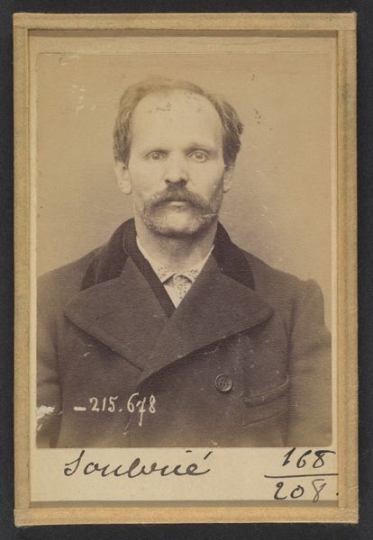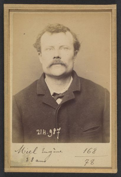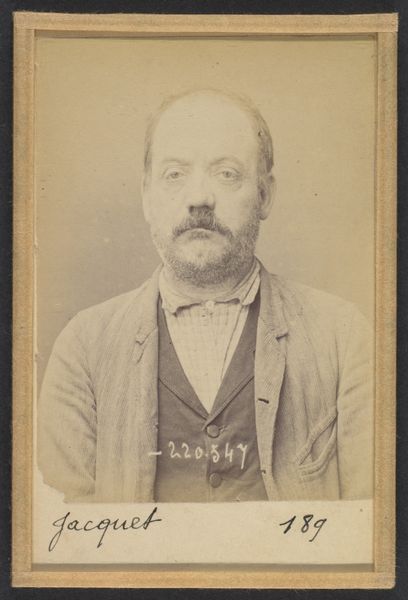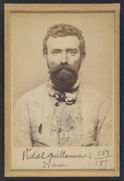 This is Alphonse Bertillon’s ‘Galau (ou Gallot). Louis. 53 ans, né à Meriziès (Tarn). Charron. Anarchiste. 21/8/93.’ The sepia tones and direct, frontal composition give the portrait a stark, objective quality. The subject, Louis Galau, is presented with meticulous detail, his features captured with an almost clinical precision. The photograph's structure, with its rigid framing and the subject's centered position, reinforces the intention of classification and control. Bertillon, a pioneer of forensic photography, sought to standardize the representation of individuals for identification purposes. This photograph, taken in 1893, exemplifies his efforts to create a visual system of knowledge that could be used to categorize and manage populations. The use of photography as a tool for surveillance reflects broader concerns about social order. Through Bertillon’s rigorous approach, we see how the very act of representing a subject can carry ideological implications, turning the individual into a sign within a larger system of power and knowledge. This piece prompts us to reflect on the gaze, and how it reflects our own ways of seeing and understanding the world.