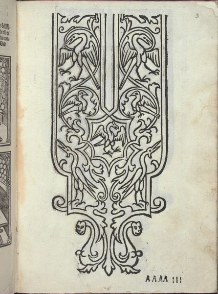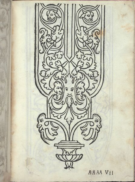Editor: This is page 8 from *Libro quarto. De rechami per elquale se impara in diuersi modi lordine e il modo de recamare...Opera noua*, dating to 1532, by Alessandro Paganino. It's a print, so intaglio and drawing I suppose. The patterns look very formal, geometric, but with these odd little faces peeking out, creating a whimsical feeling. How do you read it? Curator: Ah, this takes me back! It's more than just whimsical, isn't it? It’s a dance between control and letting loose. Look how the formal structure is subverted by these grotesque masks. Think carnival, think the world turned upside down, that spirit infuses even the most structured forms. They remind me of characters from commedia dell'arte poking fun at high society. Editor: Commedia dell'arte in a pattern book? Curator: Well, why not? Embroidery was everywhere; even if those who wore them were from "high society," everyone loves a joke. To me, they aren't separate, but constantly informing each other, high and low art influencing each other's path. The rigid symmetry only enhances the surprise. The lines are confident, assured, born out of a society that loves refinement. Yet, are the grotesque faces really that out of place in a society rife with social struggles and personal anxieties? It would almost be stranger for a 16th-century artisan not to represent a complete portrait of human character. What do you think? Editor: That’s…unexpected, to be honest. I wouldn't have thought to look at it that way. Seeing those faces as commentary definitely adds another layer. Curator: Isn’t it glorious? It goes to show that even seemingly simple patterns can hold a whole world of meaning if you dare to look beyond the surface. Editor: It's incredible how much a fresh perspective can transform how you see something.