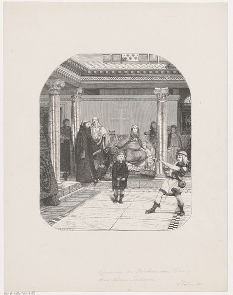 Editor: So, this is Christiaan Lodewijk van Kesteren's "Sterfbed van een koning" – or "Deathbed of a King" – made sometime between 1842 and 1897. It’s a graphite and pencil drawing. I’m struck by the somber mood, and how the crown sits there almost accusingly next to the dying king. What do you see in this piece? Curator: Well, it's a rather dramatic scene, isn't it? The clustered figures around the bed, some in prayer, others just... observing. You almost feel the weight of history pressing down, wouldn't you say? What interests me is the almost theatrical presentation, the way it stages death as a public event, really makes you wonder about the nature of power and mortality, doesn’t it? It also brings into focus the kind of academic training van Kesteren received, with all those history paintings he must have poured over, like they did back then. Does that strike you? Editor: Yes, definitely the staging and theatrical presentation is obvious! The whole thing does feel rather posed and… distant, in a way. As if we're watching a play rather than a real moment of grief. Curator: Exactly! And perhaps that distance is the point? Maybe it invites us to consider the king not just as a man, but as an idea, a symbol. A symbol whose time has come, apparently. A memento mori, in a sense. Van Kesteren clearly knew his audience and was giving them something more than just a depiction of mortality; do you follow me? Editor: I think so. It's less about the king as an individual and more about what his death represents for the kingdom and the viewers? Curator: Precisely! Death becomes a mirror reflecting societal anxieties and aspirations. Quite a feat for a drawing, don’t you think? Editor: It certainly makes you think beyond the surface. I originally saw somberness, but I now realize there is another layer here: social performance! Curator: See, art always repays close looking, always offering new perspectives on both art and life!