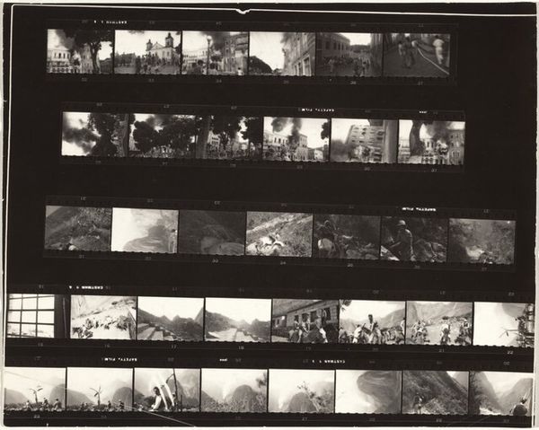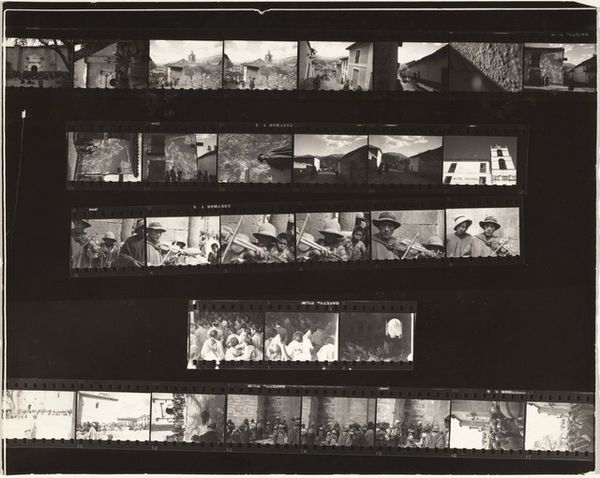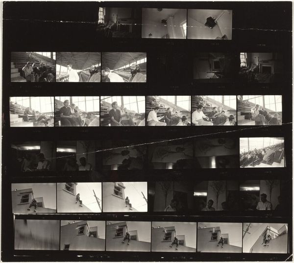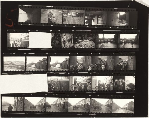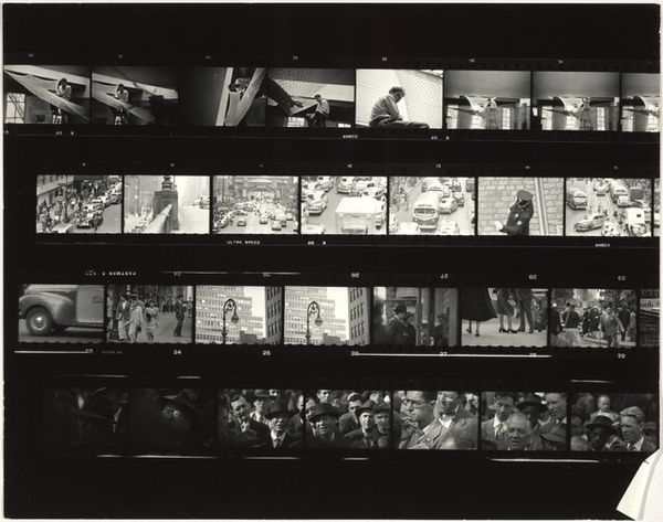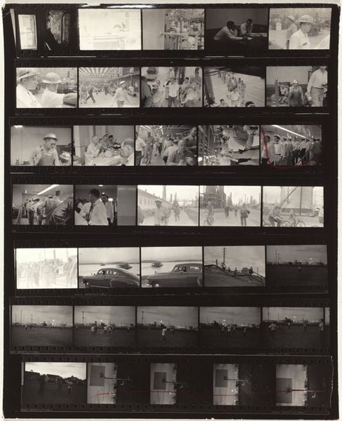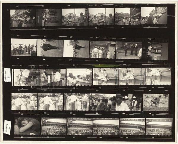 Curator: Here we have Robert Frank's “Wellfleet and Early New York City,” a gelatin-silver print made between 1949 and 1962. It's essentially a contact sheet presenting various snapshots. Editor: My first impression is fragmented memories—the contrasts between light and shadow really evoke a sense of nostalgia and perhaps a slight feeling of unease. The many tiny, disjointed images scattered on the gelatin force you to jump from scene to scene without giving you the comfort of narrative structure. Curator: Exactly. These images offer fragmented glimpses into mid-century American life. Notice how Frank juxtaposes images of ordinary people, urban landscapes, and personal moments? I see that reflecting broader cultural tensions, particularly in relation to class and urban decay, while grappling with individual vulnerability in postwar America. Editor: Considering his process is so closely tied to photographic equipment of his day, I can't help but think about the labor it would take in the darkroom, all that time in chemical solutions. It emphasizes the way image-making itself becomes a social practice, influencing the final presentation of reality and personal documentation. I also consider how the nature of gelatin as a medium deteriorates, just as lived experience tends to decompose in memory, shifting into sentiment. Curator: The selection and arrangement feel critical too. These are not just random snapshots, are they? I'm particularly interested in thinking of the placement of the crowd next to the picture of children-- I interpret it as commentary on the next generation facing systemic problems. These photos demand us to see these places in a new light. The image resists dominant narratives around progress and prosperity, challenging our expectations of art in its own quiet way. Editor: I’m drawn to the idea of how mass production techniques were used. The image looks reproducible, cheap, even. How does the ubiquity of cameras contribute to art in unexpected ways? As for labor, did Frank intend for mass reproduction? Were they striving for this style, and if so, what does that choice tell us? Curator: Perhaps his social realist project also speaks of Frank's own position as an immigrant in America, offering a distinct vision that reveals the cracks beneath the shiny surface of postwar prosperity, and allowing us to consider identity in relation to larger social issues. Editor: Seeing how the photos emphasize Frank's engagement with the materials used is extremely helpful in analyzing and deconstructing the meaning. Thinking about the process enriches the image. Curator: Precisely! It allows us to bring forth how history and contemporary theory might overlap, allowing for richer discourse to follow. Editor: It also gives rise to conversations we would normally not be capable of having by simply observing the visual alone.