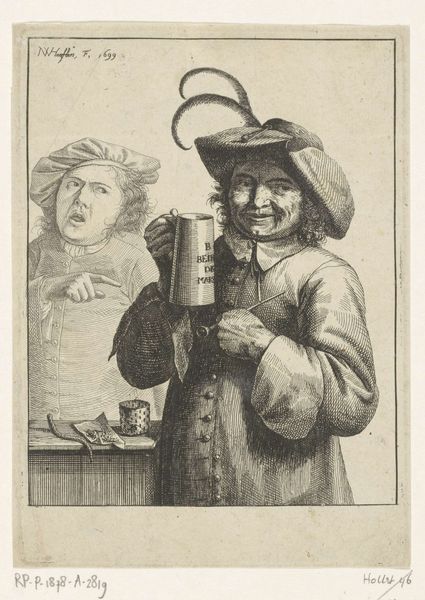Curator: This is an engraving by Jonas Suyderhoef, dating roughly from 1623 to 1686, titled "Boer met pijp en kruik in de hand bij een tafel"—or, "Peasant with Pipe and Pitcher at a Table." Editor: It’s interesting. My first impression is how intimate the scene feels, despite the somewhat coarse subject matter. The textures conveyed, even in the print, seem incredibly tactile. You almost feel the roughness of the peasant's clothing. Curator: Absolutely, and this piece fits neatly within the Dutch Golden Age fascination with genre painting, particularly scenes of everyday life. Suyderhoef masterfully captures what seems like a fleeting moment in a tavern or home, elevating it to art. Editor: Right, but the *how* is vital. The fine lines of the engraving process. Think about the labour involved in creating these plates. It's not just depicting the common man, but reflecting a whole production process connected to that subject's world, materially. Curator: Good point. It serves almost as a democratization of art at that time. Creating works available to the rising middle class rather than exclusively for nobility. The political undertones, the social role become more apparent then. Editor: Yes. Look closely at that pitcher, its design, the weight it seems to carry. This isn't just ornamentation; it's a tool, a symbol of sustenance, representing a material relationship with the peasant’s daily labor. The image becomes an artifact about materiality. Curator: Indeed. The act of smoking, drinking – those seemingly trivial acts – gain new meaning through art. They become markers of culture, social identity, reflecting values or perhaps even hinting at the socio-economic divides within Dutch society. Editor: Also, it is difficult for contemporary audiences to value engravings today since it demands such specific labor; but this image stands as testament to how essential such images were at a given point in visualizing ideas and experiences Curator: Ultimately, “Peasant with Pipe and Pitcher” offers us a small, but significant window into 17th-century Dutch life. Its appeal extends beyond mere representation, giving viewers much to contemplate about artistic skill and culture. Editor: For me it’s less about the culture and more the thingness of the peasant experience, it helps viewers reevaluate all of our relationships with materiality itself.
