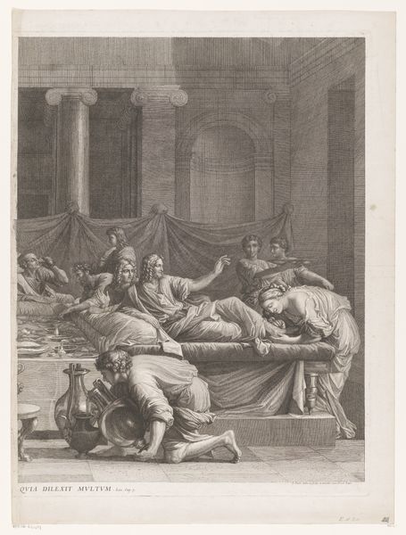 Curator: The drama is palpable, isn't it? The staging and the intensity of feeling… it almost vibrates off the print. Editor: Indeed. We're looking at "Heilig Oliesel (rechter deel)," or Holy Unction, the right section, an engraving that experts date roughly from 1633 to 1700 and which is held at the Rijksmuseum. The print is by Jean Pesne, whose engravings often captured significant historical and religious scenes. Curator: It does carry a weight of historical association. Tell me, does it strike you, too, as an almost theatrical display? Look at the figures clustered around the bed, a real mix of anguish and reverence. Is this about real suffering, or how suffering should be performed? Editor: Well, the sacrament of Holy Unction is, after all, about preparing for death, both physically and spiritually. Pesne captures that moment of vulnerability but also communal ritual, an important process socially and religiously, especially in the context of baroque sensibilities. Think about it: The patient is surrounded not just by priests but what look like family or friends, actively participating in this transition. It blurs the lines between personal and collective experience. Curator: Exactly. And how is the meaning, then, negotiated between these realms? I'm particularly drawn to the gestures. The upraised hands… are they expressions of supplication, or are they directing something divine downward? Even the architecture of the room feels laden with symbolism, particularly how the light interacts with the textures and draping. Editor: You raise an excellent point about light. It serves almost like a character itself, illuminating the patient's body while casting a long shadow from a man standing near. In terms of social context, images like this also helped reinforce the church's role in marking life's major passages. And prints were an important medium because this made potent imagery like this widely accessible. Curator: The availability speaks to its influence. Thank you; viewing Pesne’s print together, focusing on these interwoven perspectives, offers a glimpse into not just religious ceremony but baroque sensibility itself. Editor: Agreed. I appreciate having these moments unpacked, too. Seeing a print like this with fresh eyes always brings new levels of context.
