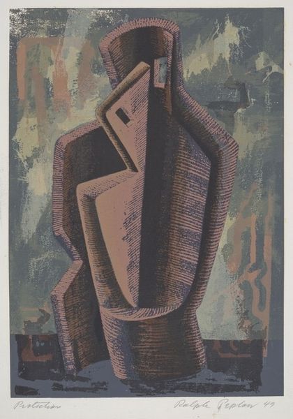 Curator: Welcome! We're looking at Picasso's "Still Life with a Glass and Ace of Clubs," created in 1914. It's a mixed-media work incorporating drawing, collage, and coloured pencil on paper, demonstrating his innovative approach to Cubism. Editor: First impression? Playful chaos. It feels like Picasso took a party, shredded it, and then meticulously glued it back together...slightly off-kilter, of course. The vertical lines really heighten the sense of an illusion within an illusion, like we're in a distorted funhouse. Curator: The use of collage is pivotal here. By integrating fragments of real-world materials like paper, Picasso challenges the traditional illusionistic painting. He brings the everyday into the realm of high art, provoking questions about representation and reality itself. Note also, this artwork was produced just as France entered World War I, and Cubism itself was entering a new chapter—one emphasizing a return to order. Editor: Order, you say? It’s like the objects are arguing amongst themselves! Seriously though, there's something so immediate about the drawn textures next to the pasted elements, especially the Ace of Clubs...like it's daring us to place a bet on this fractured world. The crude, hand-drawn lines suggest an ambivalence—Picasso understands the rules, but he's also actively breaking them, a quality amplified by the playful introduction of colorful drawing. Curator: Absolutely. This piece embodies Synthetic Cubism's move towards simplification and the construction of forms from abstracted elements. The ace of clubs, along with the glass, becomes not just a symbol, but a signifier embedded within the social and cultural fabric of the time, calling upon a traditional visual vocabulary rooted in Parisian nightlife. Editor: It's got swagger, that's for sure. The stripes, the card, the suggestion of a convivial moment... it’s also incredibly vulnerable. This composition feels precarious, like one wrong move and it all crumbles, just like our perception of things in the everyday. Curator: Indeed. In its seemingly simple arrangement, the work reflects the volatile sociopolitical conditions that formed the background for Picasso's formal explorations. A memento mori by other means. Editor: Agreed. And it reminds us that even in chaos, there's a strange kind of beauty—a beauty built on the fractures and the re-assembling of what's been broken. Thanks for highlighting that context. Curator: My pleasure. And thank you for the stimulating, poetic reading of Picasso’s visual strategies here.