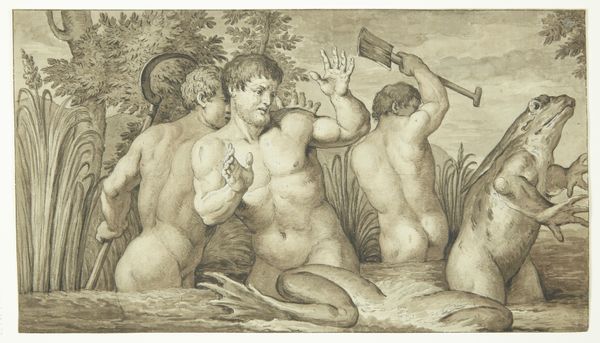 Curator: This is an etching from between 1745 and 1800, titled "Nude children shearing wheat; an allegory of Summer; after a bas-relief on the Fontaine des Quatre-Saisons (Paris)." The piece currently resides here at the Metropolitan Museum of Art. Editor: It feels incredibly whimsical. The lightness of the sketch, combined with the carefree children, gives a strong sense of innocence and summer joy. But the children performing labour, shearing wheat no less, is what really catches my attention. Curator: Note how the image harkens back to classical motifs with its depiction of idealized figures engaging with nature. These aren't just children; they're embodiments of Summer’s bounty. Think of it as a deliberate revival, pulling from antiquity, to give legitimacy to the Bourbon dynasty in 18th century France through artwork accessible to the public. Editor: It’s interesting that you mention legitimization through accessible public art. Because if we consider these figures allegorical, could they also represent an idealization of childhood, disconnected from the lived realities of poverty and child labor that was pervasive at the time? Curator: That's an insightful reading. Symbolically, wheat has always represented sustenance, fertility, and abundance. The depiction of labor performed by children evokes both an active engagement with nature's gifts and hints to a cyclical and seasonal continuity central to societal wellbeing. They're timeless archetypes representing life. Editor: True, the timeless archetypes that conceal real conditions and political implications. While the wheat signals plenty, it hides how resources are actually distributed. We could even see how the rabbit might function here, not just a harmless animal, but as a metaphor for scarcity during times of political turmoil where rabbits are being poached for their meat. Curator: Interesting counter-read, looking at a familiar image with fresh eyes. But as we contemplate the visual dance of symbolism and societal realities, let's allow the carefree mood of summer in the artwork’s bas-relief, if but for a moment. Editor: Point taken. The charm of summer depicted here does offer a point of rest amidst historical critiques, almost a gentle respite—if we allow it to be.
