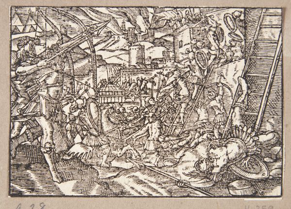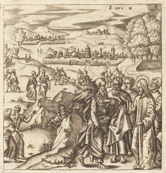 Jean de Tournes created this woodcut illustration in Lyon as part of the "Biblia Sacra" publication. The stark contrast of black ink on paper immediately directs our eyes across the landscape of biblical narrative. The composition, with its meticulously etched lines, captures the scene with a documentary precision. The artist uses dense clusters of lines to define forms and create texture, contrasting the smooth, open spaces with areas of intense activity. Notice how the figures gather manna against a backdrop of tents and rugged terrain. The engraving technique, common in the 16th century, not only facilitates the mass production of images but also brings a unique aesthetic quality to the artwork. The meticulous use of line and form invites viewers to interpret the divine provision within the context of human labor and survival. This art is not static; it engages in a dialogue about faith, sustenance, and the visual communication of religious stories.