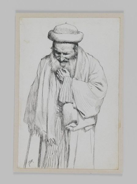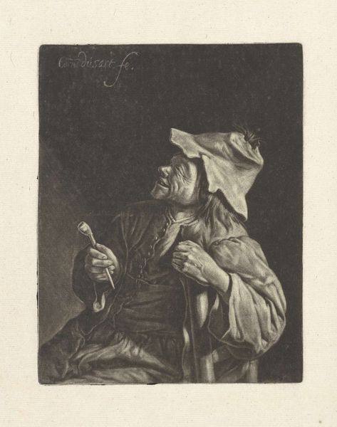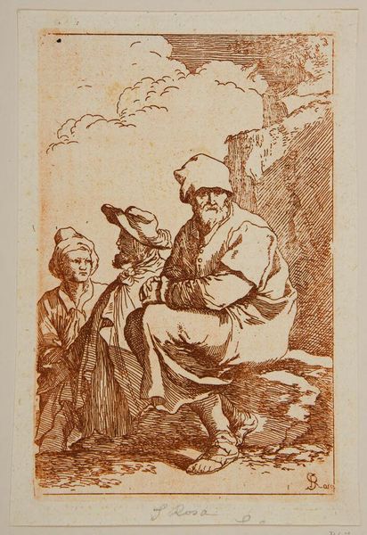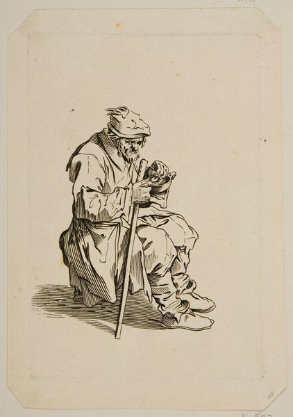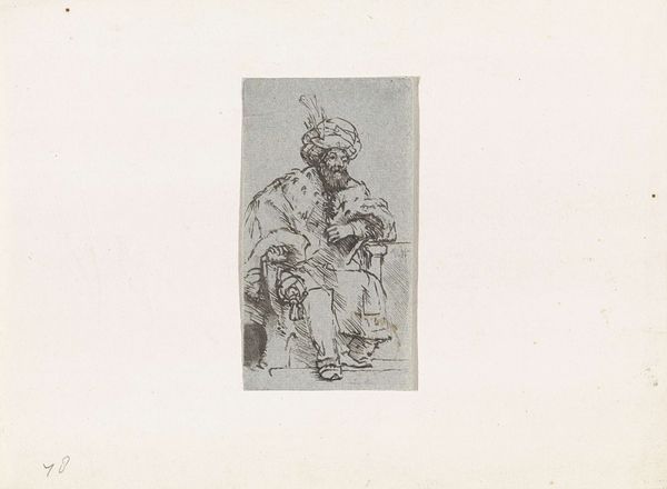 This etching, *Zittende bedelaar*, was made by Izaak Riewert Schmidt, sometime before his death in 1826. The eye is immediately drawn to the figure of a seated beggar, enclosed within a sharply defined rectangular frame. The use of line is striking, creating a stark contrast between the detailed figure and the surrounding blank space. Schmidt's skillful handling of etching techniques renders the beggar's worn clothing and gaunt features with remarkable clarity. Consider how the rigid structure of the frame contains the vulnerable figure, thereby suggesting a broader commentary on social structures and the marginalization of individuals. The artist's emphasis on line and form invites us to think about how the material qualities of the artwork shape its message. It is a message that resonates beyond its immediate subject to engage with enduring questions of human experience and social order.