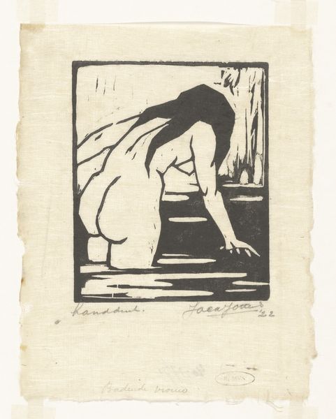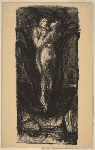 Curator: Ernst Ludwig Kirchner created this evocative ink drawing, "Standing Nude in a Room," in 1921, during a period when he was wrestling with post-war trauma. Editor: Wow, she seems incredibly isolated. Almost cornered, by both the composition and something unseen. It's like she’s huddling for warmth, but emotionally too. The black ink seems to absorb all the light and energy around her. Curator: The use of stark contrasts, those brutal, almost slashing lines, are hallmarks of German Expressionism, a movement defined by artists’ profound unease and subjective response to the modern world. We see its influence profoundly in Kirchner’s nude. The sharp edges mirror the discord and fragmentation they felt within themselves and society. Editor: Definitely discordant. Even the wallpaper feels oppressive. It reminds me of anxieties experienced when moving to a new place... unpacking and being surrounded by boxes, and a lack of control. There is an uncomfortable claustrophobia emanating from all the surfaces and the subject's tense stance. Curator: Yes, the visual chaos certainly speaks to a deep psychological unrest, reflecting Germany's socio-political turmoil after World War I. The naked body itself, often symbolic of vulnerability, in this context it really communicates a sense of being exposed and defenseless against external and internal forces. Editor: It also occurs to me how the visible window acts almost like a distorted picture frame for a hidden drama. I'd love to know more about that hidden setting... is it more chaos that she can't escape? And perhaps in the same way she can't leave this dark print, neither can we as viewers dismiss it. Curator: Kirchner consistently deployed nude figures in interiors to mirror internal emotional states, making the domestic setting a landscape of psychological revelation, a mirror reflecting her hidden vulnerabilities, so clearly outlined for us here. Editor: It's hard to look away from its bleak honesty. This ink drawing really pulls the spectator into a quiet storm of anxiety. The weight of all those internal pressures just radiating outwards... fascinating. Curator: Indeed. And that stark honesty continues to speak to viewers who can readily see these raw emotions and vulnerabilities. A visceral piece for the ages.