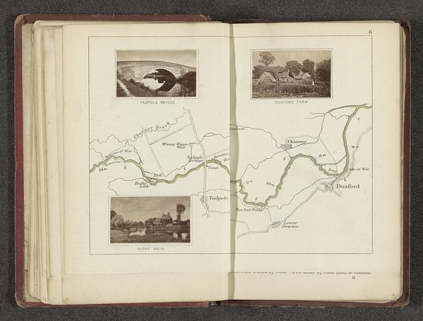 Editor: This page, "Kaart met twee afbeeldingen van de ruïne van het klooster en een forellenvijver bij Godstow" by Henry W. Taunt, likely dating before 1879, blends a watercolor map with inset photographs. It's so interesting how the detailed map contrasts with the faded quality of the photographs, lending the page a bittersweet, historical aura. What strikes you most when you look at this? Curator: Well, immediately I'm transported! It's not just a map; it's a portal, wouldn't you agree? To a time when seeing a place involved a very different kind of seeing – slower, more mediated, and handcrafted. It speaks volumes about how we used to record and remember landscapes, interweaving the precise with the pictorial. Tell me, does the map's aesthetic remind you of anything specific? Perhaps a childhood memory of pouring over adventure books? Editor: Actually, yes! I remember devouring old maps in adventure books, which made everything feel so tangible. Curator: Exactly! There's a distinct romanticism to that bygone era. Also, consider the intention here – combining practicality with pictorial memories, documenting "the Trout Godstow" and "Ruins of Godstow Nunnery" alongside a geographical layout. Almost as if Taunt is inviting us to consider not just 'where' but 'what once was'. And the ruins, almost wistful, right? Editor: Definitely. It’s like he's highlighting the layers of history within the landscape. Curator: Precisely! And don't you think it's a subtle comment on change, remembrance, and how places evolve in our minds as much as in reality? That melding of medium—watercolors with what I presume are early photographic prints—makes me wonder about how technologies influence each other to affect not only artistic choices but cultural memory as well. A puzzle and a poem. What an intriguing juxtaposition. Editor: I hadn’t thought of it that way before. Thanks for opening my eyes to those layers of interpretation. I'll certainly remember that when looking at similar works. Curator: Anytime. That’s why art continues to fascinate—it’s not merely looking; it is experiencing thought made tangible.