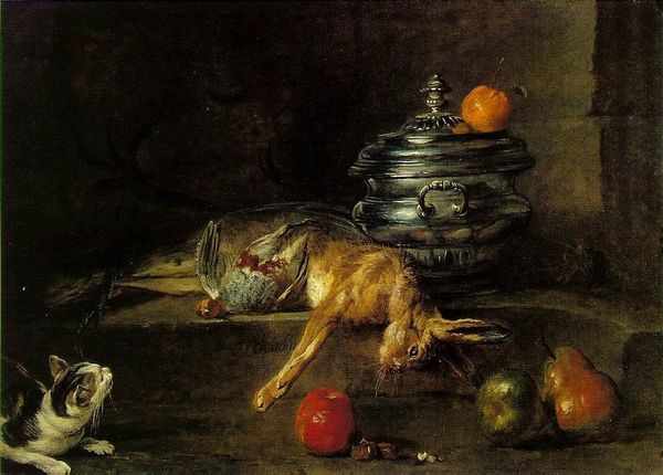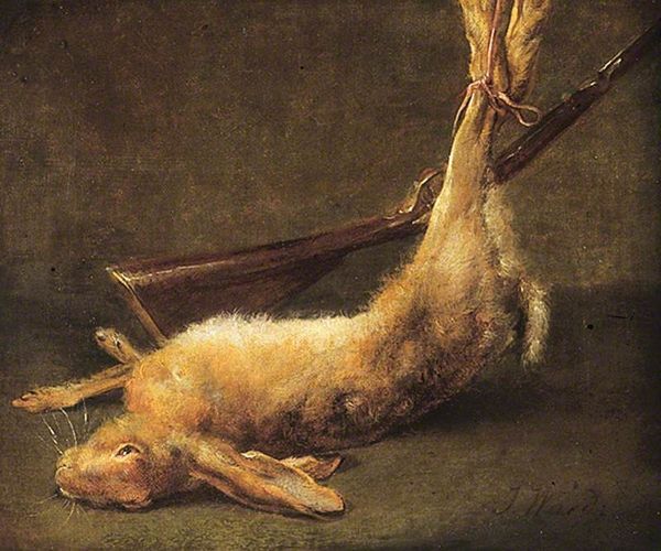 Jean-Baptiste-Siméon Chardin’s “Wild Rabbit with Game Bag and Powder Flask” offers a glimpse into the aristocratic hunting culture of 18th-century France. Born to a modest background, Chardin distinguished himself in a world that prized opulence and the spoils of the hunt. Here, the lifeless rabbit becomes a focal point, a stand-in for themes of mortality and the complex relationship between humans and the natural world. While ostensibly a still life, the painting subtly critiques the decadence of the French aristocracy, who often engaged in hunting as a display of power and privilege. Chardin's choice to foreground this seemingly simple subject holds profound social and personal dimensions. The image invites us to contemplate the ethical implications of hunting, reflecting on the lives taken for sport. At the same time, the intimacy of the scene suggests a more personal contemplation on loss.