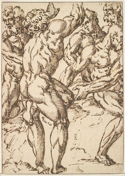 Curator: Here we have "Four Nudes and the Head of a Fifth" by Baccio Bandinelli. Bandinelli, who lived from 1493 to 1560, was a contemporary of Michelangelo. Editor: Wow, this drawing feels like a bunch of figures tumbling into each other, a muscular, chaotic knot. Curator: Bandinelli, though skilled, always seemed to be vying for Michelangelo’s spot, which shaped his public image and critical reception. Editor: Right, there's this sense of struggle here—not just in the figures' forms, but almost as if the artist is wrestling with the drawing itself. Curator: He worked in a Florence where artistic patronage was closely linked with political power. Bandinelli was favored by the Medici, which obviously impacted how his art was perceived. Editor: It's like he's flexing his artistic muscles, desperate to prove something, even if it means sacrificing some of the grace. Curator: His work is now appreciated as an example of the competitive artistic landscape in Florence at the time, especially regarding the politics of imagery. Editor: After looking again, the human form contorted in ways that speak to something deeper.