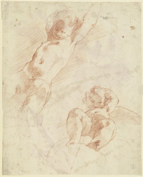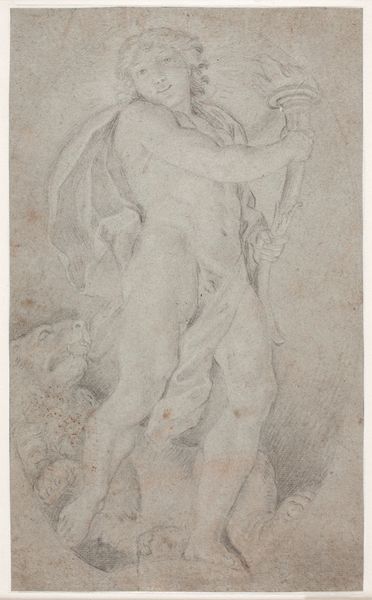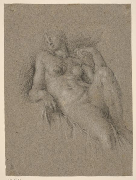 Curator: Here we see a study by Hendrik Krock. Created sometime between 1671 and 1738, this drawing titled "Tilbagelænet mandlig modelstudie" depicts a reclining male nude and belongs to the collection of the SMK, the National Gallery of Denmark. Editor: Huh. It reminds me of one of those anatomical studies you see in old medical texts. Somber, almost…spectral. Like an unfinished thought. Curator: It is academic art. We can understand it as a work deeply connected to the Baroque portrait style, focused on idealizing the human form and conveying movement and emotion. The reclining pose may be reminiscent of classical sculptures and evokes contemplation or perhaps vulnerability. Editor: Vulnerability, yes. The guy's got a relaxed vibe but, with the pale hue, the sketchy outline...he's presented kind of raw, stripped bare in more ways than one. Curator: These academic studies often focused on specific elements—form, light, shadow—to prepare artists for larger, more complex compositions. The symbol here may be of knowledge seeking and a display of technique—skill at capturing musculature and form. Editor: Perhaps. Or maybe it’s the fleeting nature of beauty. Everything decays; that’s what the great still lifes told us! You know, for an anatomical study, there’s almost something dreamlike about it, maybe because of that diffused, faded palette. Curator: Dreamlike qualities weren’t necessarily the artist’s main goal but I appreciate how this aesthetic contributes to an enduring mystery. Editor: Definitely intriguing! It's one of those pieces where the imperfection—the rawness, if you will—becomes the real statement. It stays with you somehow, you know? Curator: Precisely. It shows how technical exercise transforms, perhaps accidentally, into something emotionally compelling. Thank you.