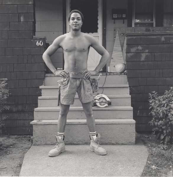 Curator: Before us we have Rosalind Solomon's 1987 gelatin-silver print entitled "New York," a captivating work from her street photography series. Editor: My first impression is one of understated masculinity, even a slight awkwardness. The man seems posed yet unaware, almost trapped within the frame of a very suburban mundanity. Curator: Solomon often focused on the intersection of the personal and the political. Consider the time this photograph was taken. The AIDS crisis loomed large, Reaganomics transformed urban landscapes. How does this portrait engage with or challenge those power structures? Editor: The domestic symbols are what immediately speak to me. The quaint white door askew, the manicured bushes… they're such potent visual signifiers of stability and perhaps even conformity, violently disrupted in those days by the reality of the HIV virus which turned accepted norms and identities on their heads. Curator: Exactly! Think of the work of artists like Felix Gonzalez-Torres at this time and his focus on similar themes. Solomon isn't simply capturing an individual; she's engaging with the collective anxieties and societal shifts occurring in 1980s America. What narratives are embedded in those everyday images? How do these details either confirm our assumptions, or expose latent contradictions? Editor: This makes me consider how gender roles of that time and its anxieties regarding identity are represented by the work as a whole. The subject's nonchalant pose seems deliberately ambiguous when placed within this intensely cultivated space, making him both present and also out of place. This portrait serves as more than mere documentation; it serves as visual metaphor. Curator: Yes! It is as though his self-assured, "average" male image, ironically captured here as black-and-white gelatin print, aims toward objectivity, while failing spectacularly to escape a complex social web of identity. He's a man captured, not as the powerful urban hero he envisions, but frozen in time with that skewed angle. Editor: A moment of reflection on how seemingly "stable" representations are often reflections of societal instability. I now recognize an underlying symbolism in how Solomon juxtaposes person against this disquieting environment to great emotional impact. Curator: Solomon has done that well here! The impact of social issues that surrounded the era now is much better seen. Editor: Indeed! It is a work to revisit and consider deeply.