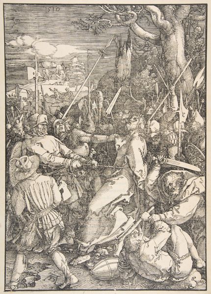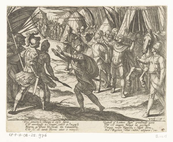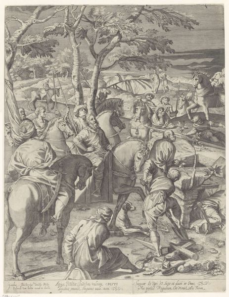 Curator: Look at the line work in this 1550 engraving; it's so incredibly precise, giving depth and texture with just ink. This piece, found here at the Rijksmuseum, is called "Jozef informeert naar zijn broers," created by Dirck Volckertsz Coornhert. What springs to mind when you look at it? Editor: Chaos. I see figures densely packed, sprawling, seemingly caught in some kind of tormented dance or struggle. There's a central figure who seems to oversee everything, though. It feels claustrophobic and a little unnerving. Curator: It definitely captures a specific tension. Coornhert has this amazing ability to depict the human figure in very expressive ways. Given his humanist background, I wonder what compelled him to depict the brothers this way. It’s not a simple retelling; there's a raw, almost unsettling quality. Editor: Considering that this is an engraving, let’s think about production. Someone painstakingly etched this entire composition—these swirling masses, each little figure—into a metal plate, using a burin, line after line. It wasn't quick or easy. And each print meant wearing down that plate a little bit more. Curator: A deeply laborious process, for sure. I always think about how those decisions during production influence meaning; each choice, each addition of line, is inherently connected to the final narrative. This feels particularly potent here given the biblical narrative's focus on fate. I'm getting a sense of dread just considering it. Editor: Right, so the physical act of creation – the labor involved in pulling this story from the matrix of the material world - gives it weight. I'm thinking also of the Northern Renaissance obsession with detail; a desire for accurate and precise representation, not only about storytelling, but an inquiry into how prints like this one moved, who could afford them, and the potential impact it would have. Curator: It’s a powerful image when you consider that it speaks to us across so many centuries, reminding us that certain anxieties and dramas are timeless. It seems that there is a very contemporary aspect of our engagement and understanding of its impact, a shared understanding of something intrinsically emotional that lingers beneath the surface. Editor: Exactly. When you consider its materials—the deliberate deployment of ink—alongside distribution methods, you've got the start of mass communication…It makes me see "Jozef informeert naar zijn broers” as not only a work of devotion, but something that would spark real political discourse through images.