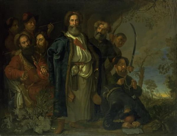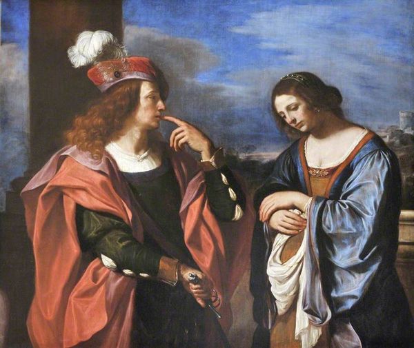 Curator: Looking at this painting by Domenico Fiasella, titled "Cristo e la Samaritana", currently held at Palazzo Bianco in Genoa, Italy, one immediately sees… well, to me it screams, 'misunderstanding!' Editor: It feels staged to me. Look how the stark lighting emphasizes the contrast between the figures. They are placed geometrically: a light Samaritana standing by a well is in tonal opposition to a dark Christ seated by the same well. There's drama brewing. Curator: Drama indeed, but that’s inherent to the narrative. Fiasella's captured that loaded pause. Christ's request, "Give me a drink," upended societal norms, right? That's the essence, the humanity! The woman's surprise, beautifully rendered, is all about that collision of expectations and...well, grace. It gives me the feels. Editor: Note the compositional choices, though. The well acts as a visual and symbolic fulcrum; the landscape fading in the background focuses us on the protagonists. His line of sight towards her contrasts with hers directed toward the well's bucket and rope. This forms a visual dialectic, right? We witness that exchange. Curator: Oh, definitely, and the choice to paint it—or *stage* it, as you smartly said earlier—outdoors brings it down to earth, lets us breathe the same air, right? Those subdued earth tones, the way his hand almost pleadingly extends, there's an emotional vulnerability that's incredibly relatable, beyond just religious context. I’m thirsty myself now just thinking about that moment. Editor: The brushwork enhances the dynamism. See how it captures light and textures in both figures, yet, they’re clearly positioned in distinct spaces—her, connected to physical labor, to him, connected to…divine expectation. I feel like each composition mirrors both internal states, her confusion with his calm directness. Curator: Absolutely. It’s a masterclass in non-verbal storytelling. Fiasella got at that potent tension, that life-altering moment over a simple cup of water, through form, tone, lighting… all the things, I suppose, come together! That’s it I guess! Editor: Yes, that interaction captures it; we witness the formal qualities reflecting on that turning point that marks that first exchange in tone. Intriguing!