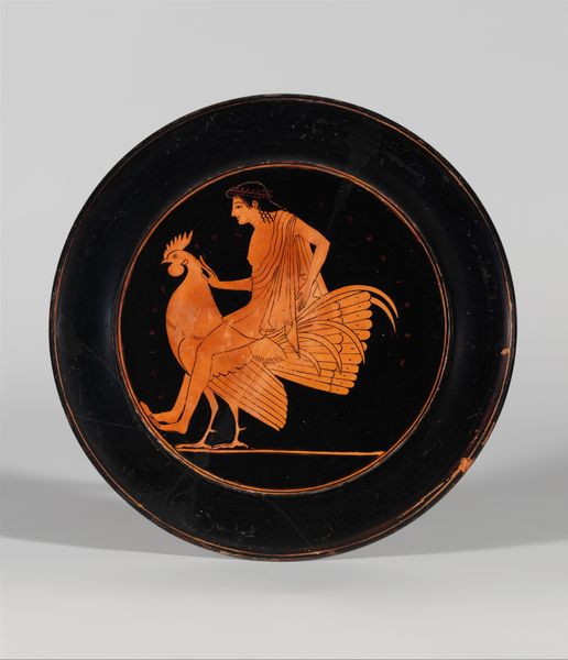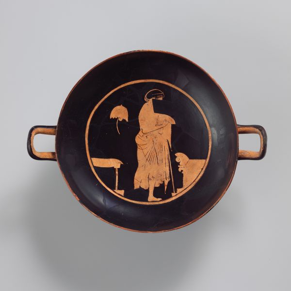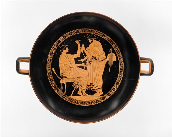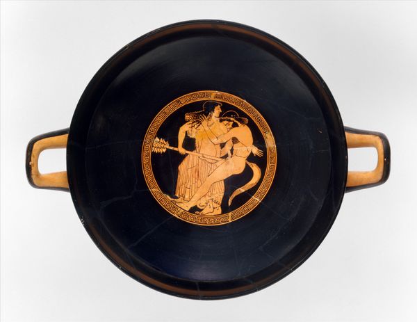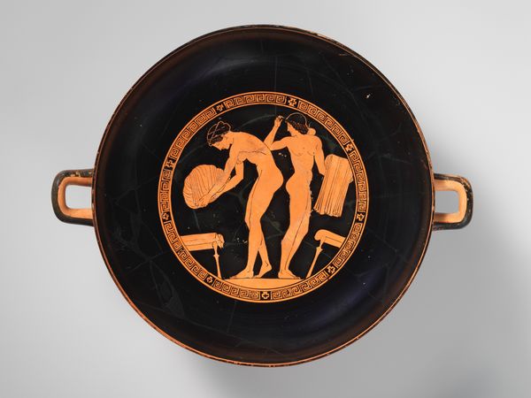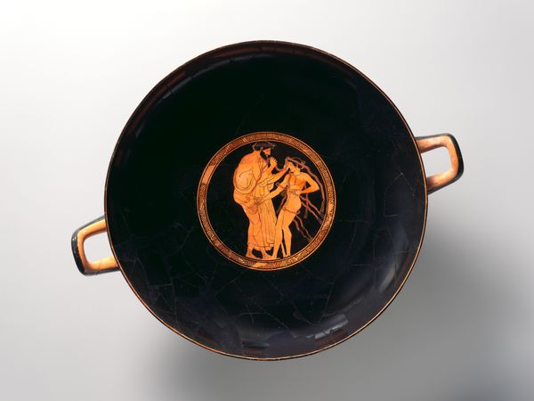 This terracotta kylix, or drinking cup, was crafted by Euphronios. The visual experience is dominated by the contrast between the lustrous black glaze and the reddish-orange figures. The central scene, a tondo, features a dynamic composition within a circular frame, drawing the eye inward. The figures, rendered with a high degree of anatomical detail, interact within a carefully structured space. Euphronios’s command of line and form is evident in the way the figures are posed and how their bodies convey a sense of movement and tension. The negative space around the figures is just as important, creating a balanced interplay between solid and void. This piece challenges fixed meanings by using a semiotic system of signs which would have been recognized within its cultural and philosophical context. The kylix should be viewed not merely as a functional object but as a site of ongoing interpretation, where form and function intersect with cultural and philosophical discourse.