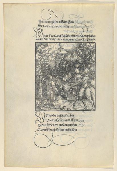 Hans Burgkmair created this woodcut, "Ehrenhold Delivering Ehrenreich's Message to Theuerdank," in the early 16th century. The print comes from the series "Theuerdank," commissioned by Emperor Maximilian I, and provides a glimpse into the performative aspects of Imperial power and identity during the Renaissance. Consider the characters depicted: Ehrenhold, the messenger, stands before Theuerdank, embodying loyalty and service. The context is steeped in the chivalric culture of the time, where honor and allegiances defined social standing. What does it mean to craft and control a message? What are the power dynamics at play when one controls narratives of heroism and virtue? Note the emotional weight the artist assigns to each figure through details such as posture and attire. Burgkmair’s compositions contributed to a visual language that reinforced social hierarchies, and perpetuated idealized images of masculinity, heroism, and the Emperor’s reign. This image invites us to reflect on the ways in which those with power, like Emperor Maximilian I, control their narratives and shape collective memory.