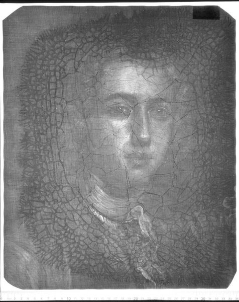 Curator: This is an X-radiograph of "Tuckerman Salisbury (Mrs. Stephen Salisbury I)". The original portrait was painted by Chester Harding. Editor: It's a ghostly image, like looking through a veil. The woman's face is discernible, but it has an ethereal quality. Curator: Radiography reveals underpainting and alterations, giving insight into the artist's process that is normally hidden from view. This allows us to understand 19th century portraiture. Editor: It also strips away the facade of the finished portrait, the constructed image. We see the raw structure, the bare bones, so to speak, which is deeply revealing. Curator: Exactly, revealing choices that inform the historical context of the portrait's creation. Editor: It's a powerful reminder of the layers of meaning embedded in an image. A shadow of what once was, literally.