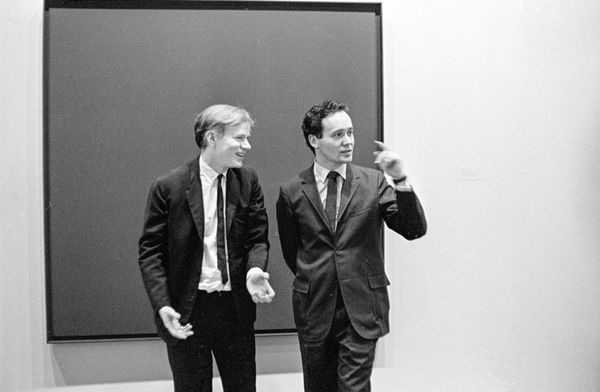 Editor: Larry Fink's black and white photograph, "Gallery Opening, New York City," really captures a moment of unexpected intimacy. The contrast between the two figures is so striking. What do you see in this piece, especially in relation to social dynamics? Curator: Fink’s work often dissects the nuances of social class and power. The framing of these two individuals seems to highlight a performative aspect of identity. The man in the suit, with his affected air, contrasts sharply with the other, who seems less concerned with appearances. How do you think Fink uses the camera to challenge those power dynamics? Editor: That's interesting! It almost feels like he's capturing a fleeting moment where those constructed barriers momentarily break down. Curator: Exactly. Fink’s use of flash, the raw, almost confrontational style, democratizes the image. It suggests a leveling of the playing field, even if only for the fraction of a second the shutter is open. Editor: I see what you mean! It pushes me to reconsider how we perceive those curated social interactions. Curator: Precisely. The photograph becomes a tool for social commentary, prompting us to question the very fabric of these staged events.