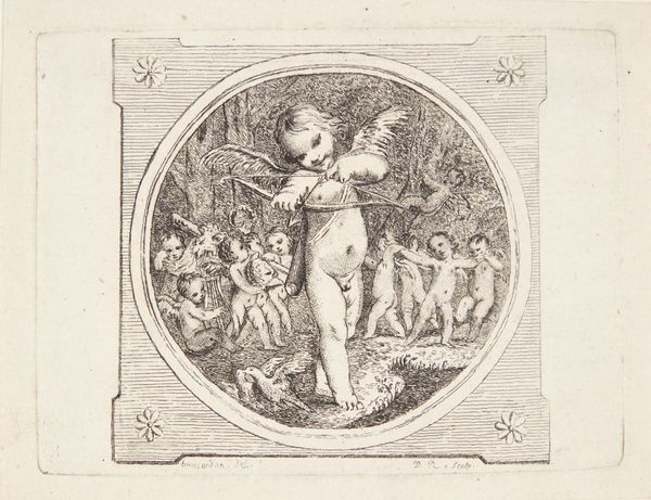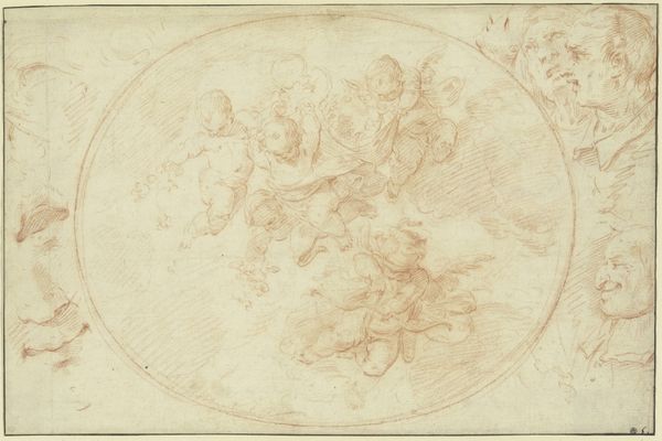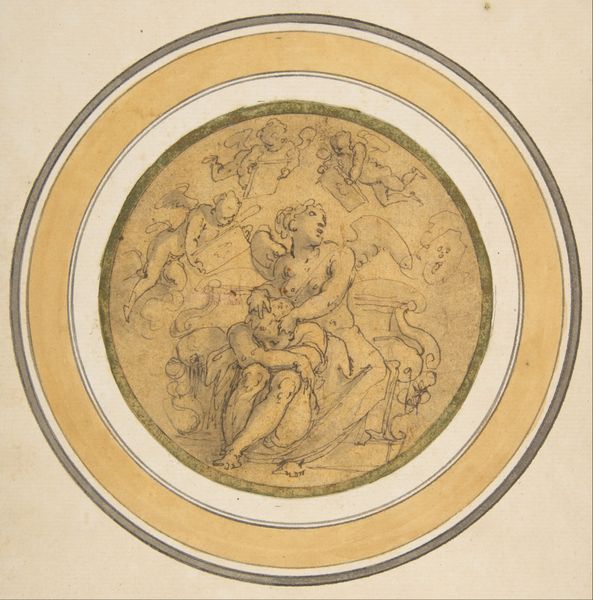 Curator: Look at this delicate drawing, seemingly floating within its circular frame. This is "The Chastisement of Cupid by Jealousy in the Presence of Diana and Mars," created between 1692 and 1700 by Marco Antonio Franceschini. It's rendered in pen, pencil, chalk, and ink on paper. Editor: My first impression is one of ethereal lightness, even fragility. The muted palette and swirling clouds contribute to a dreamlike quality. There's a tension between the softness and the underlying drama hinted at by the title. Curator: Franceschini was very active in Bologna and Rome. Here we see classical allegory through a very Baroque lens. These mythological scenes were frequently commissioned to signal the patron’s education and access to a noble, cultivated heritage. Note how Diana, goddess of the hunt, and Mars, god of war, observe the punishment of Cupid. Editor: The iconography is rich, and I am drawn to Cupid's posture: he seems to almost stumble on his cloud. Cupid's placement at the bottom suggests a fallen state or loss of innocence, visually enacting the "chastisement" of the title. Also, how jealousy in the scene takes the position of angel, taking him down. Curator: Indeed. It reflects the Baroque era's fascination with drama and morality, offering a visual lesson about the perils of unchecked desire. These figures – Mars with his sword, Diana looking away, it gives us the drama. Editor: I also think about the context of display. Knowing this was likely a preparatory sketch offers insight into artistic processes. We have these layered clouds, suggesting both divinity and volatility in emotions. Were these public lessons, too, though? What was it conveying? Curator: Most likely private – displayed for family or visiting dignitaries in the palaces for which they were frequently made. The classical references signaled one's level of education and power, their access to antiquity and the humanist project. Editor: It’s incredible how much symbolism is packed into what seems like a simple sketch. It gives you chills in terms of how relevant these messages stay in time. Curator: Precisely! The drawing's delicate execution belies the complex social and artistic milieu from which it emerged. Editor: Exactly – this glimpse into both human passion and higher ideals definitely remains potent, and resonates with viewers today.