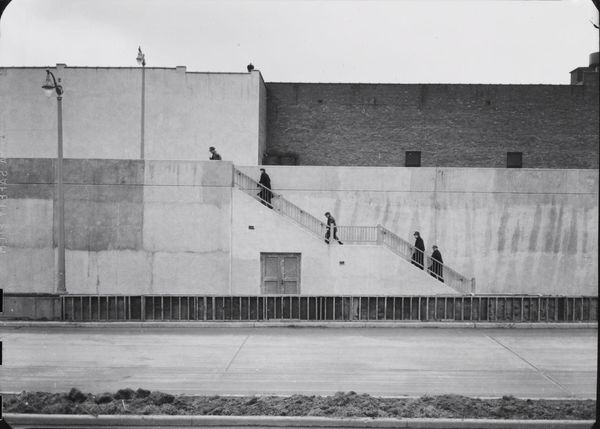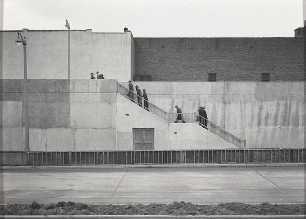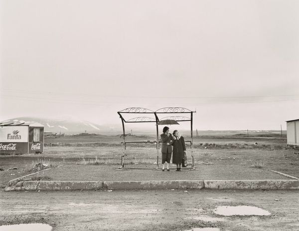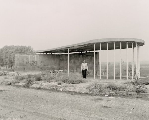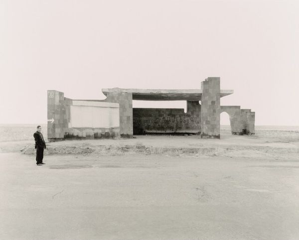 Curator: Ursula Schulz-Dornburg's "Gymri - Erevan" from 2000 presents a stark landscape, captured through her distinctive photographic lens. Editor: My first thought? It's haunting. The monochrome palette amplifies the sense of isolation, and the geometric structures seem stranded. Curator: Indeed. Schulz-Dornburg often focuses on architectural remnants, exploring how structures embody historical and cultural narratives. We must understand that this piece continues her well-documented "Transit Zones" theme which concentrates on spaces in-between borders, and national edges, and areas once strategic for global economies now dilapidated or forgotten. This project in particular focused on the border between Turkey and Armenia. Editor: Right. And this border specifically carries immense weight, burdened by histories of conflict and political tension that relate to questions of memory and territorial control. I mean, looking at these block-like brutal structures you feel the weight of the concrete as representing not just physical barriers, but symbolic ones. Curator: Precisely. The use of black and white enhances the timeless quality, distancing the scene yet also universalizing it. It's not simply a record of a place, but an exploration of how political landscapes are constructed and experienced. Schulz-Dornburg photographed such sites using film with medium-format cameras, in black and white, without manipulation or alteration, and this consistency allowed for all her Transit Zones project photographs, while of very different geographies and structures, to be compiled and collected in publications later. Editor: And even within the limited grayscale, there are powerful tonal variations. The textures of the asphalt against the dilapidated buildings is poignant. It feels almost apocalyptic. Even if it represents the year 2000, we are prompted to reflect on issues of marginalization and abandonment which affect today. It serves as a quiet yet firm statement against such issues. Curator: Absolutely. Her consistent artistic choice not to use colors removes any sensationalizing and it places these constructed architectural geometries, along with nature's softer landscape in contrast. It's almost as though she's asking us to reassess our understanding of geopolitical divisions and their material legacies. Editor: A reminder that even seemingly inert structures carry stories of power and displacement. It makes you wonder who has been through this space, and what it represents for those crossing over from Armenia. The work definitely leaves you pondering what “border” even means in today’s climate of political divide. Curator: It invites a critical engagement with the socio-political implications embedded in seemingly simple landscapes, which is why the work remains so poignant to our present, offering new perspectives through which the observer can engage with the image and its contexts. Editor: Agreed. The photograph acts almost like a time capsule.
