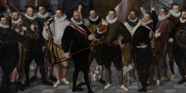 Editor: This is Lavinia Fontana’s “Portrait of the Coozzadini Family” painted in 1584 using oil paints. What immediately strikes me is how this is not just a portrait, but also a carefully staged presentation of social standing. What is your take? Curator: I think you're spot on! This piece reflects the socio-political dynamics of the Italian Renaissance, doesn’t it? Fontana was not only portraying a family but constructing an image of dynastic power. Look at the detached gazes of the men hovering in the background, almost like ancestral portraits come to life. How do you interpret that choice? Editor: It feels like they're there to legitimise and oversee, symbols of the family’s enduring legacy and lineage, maintaining control from beyond. The women in the foreground, with their direct gaze, appear to signal something different... Curator: Exactly. Consider Fontana's position as a woman artist in a male-dominated field. Doesn't it make you wonder if the painting is about quietly signalling a matriarchal assertion of influence and continuation within a patriarchal system, with the pet dog almost a symbol of domestic fidelity and privilege? Editor: It does! Perhaps this wasn't only about representation, but also subtly pushing against the norms. I will definitely see it with fresh eyes. Thank you. Curator: And I am seeing it anew, by reconsidering Fontana's visual vocabulary beyond artistic expression to recognize the politics embedded within, subtly defying norms and celebrating lineage, with clever contextual reading. Thank you.