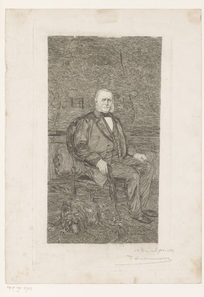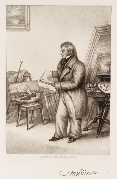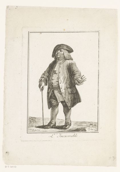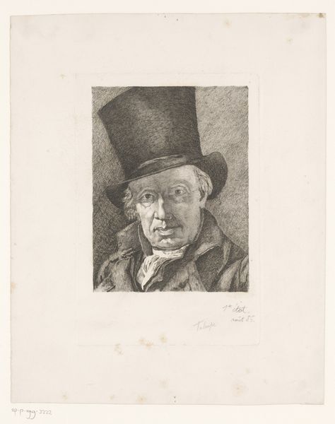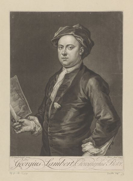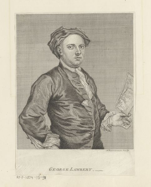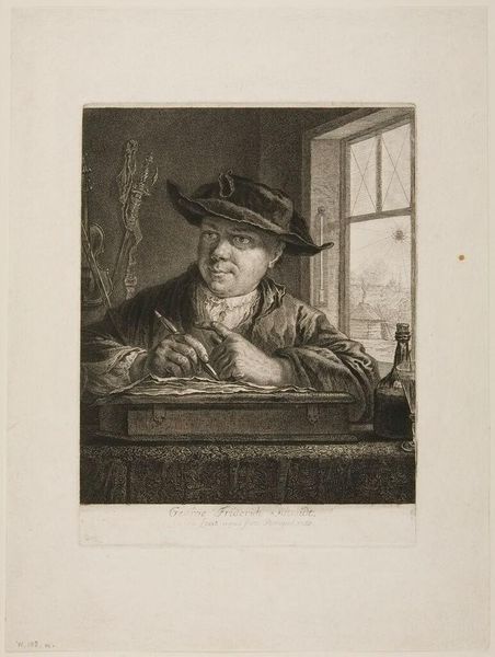 Curator: Let's examine this etching by John Greenwood; it's titled "Portret van Klaas Verlaan" and dates from between 1739 and 1792. What strikes you initially? Editor: A somewhat subdued mood. The limited tonal range creates an atmosphere of quiet contemplation, even introspection. The sitter seems…world-weary? Curator: It is indeed an understated use of line and tone. Note the precise hatching and cross-hatching employed to build form. See how Greenwood defines Verlaan’s features and clothing, relying on subtle gradations to convey depth. Editor: And I can't help but notice the contrast between the sitter and the implied wealth that the context of a commissioned portrait and the cityscape background communicate. I mean, a pipe was not a sign of working-class identity in this era! The etching gives me pause. The image feels almost subversive. It complicates simplistic notions of status and power that so often color artistic representation of that period. Curator: Subversive perhaps in its lack of overt grandeur. Instead of idealizing his subject, Greenwood seems focused on capturing his character and likeness, imbuing a particular quality to the lines and rendering of surfaces. Editor: Right, consider the inscription at the bottom – difficult to read without close examination, but presumably offering some narrative context or encomium related to Klaas Verlaan's profession or status. And what of that detail glimpsed outside the window, maybe suggestive of trade routes, linking Verlaan, even if obliquely, to mercantile endeavors and to the dynamics of colonial exchange? Curator: It draws our eye to the symbolic world beyond the individual. It could imply prosperity or maritime industry; there are multiple readings we can make about the window itself and what the outside view signifies, just as there are numerous ways to look at the relationship of form to meaning in this work. Editor: True. By layering interpretations and appreciating both the aesthetics and socio-political undertones, we find more than just a portrait. It is really a study of how representation both obscures and reveals truths about identity and social strata.