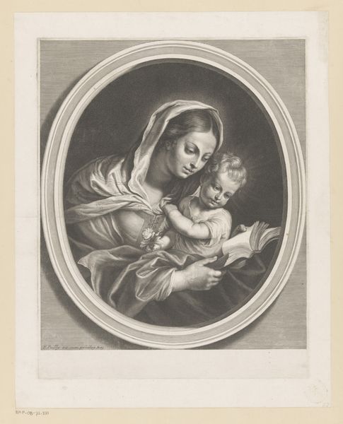 Nicolas Pinet created this print, "Maria met kind in bloemenkrans," using engraving techniques. Notice how the composition is structured around contrasting textures and forms. The soft, flowing lines of Mary's drapery and the delicate petals of the floral wreath encircle the solid, rounded forms of Mary and the Christ Child. This contrast isn’t just visual; it invites reflection on the symbolic binary oppositions between the earthly and the divine, the temporal and the eternal. The halo above their heads, a conventional signifier of holiness, is rendered here with a subtle radiance that draws our eyes to the serene facial expressions. Pinet employs a semiotic system, using recognizable visual symbols, which invites us to interpret their deeper cultural and religious meanings. The image's symmetrical arrangement gives a sense of balance and harmony. However, this harmony could also be seen as a way of reinforcing traditional religious values, reflecting how art can both express and reinforce cultural norms.