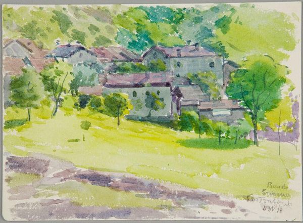 Curator: Denman Waldo Ross's "Landscape with House, Giverny, France" captures a serene scene in watercolor. Editor: The overall effect is dreamlike, almost fading into the mist. The house looks as though it’s being swallowed by the landscape itself. Curator: The washes of color certainly contribute to that feeling. Ross employs a limited palette, favoring blues and greens that blend seamlessly. Editor: The house feels almost incidental, a structural interruption to the otherwise continuous field of color. It’s like a forgotten memory, soft and indistinct. Curator: Perhaps that’s the beauty of Giverny; even structures yield to the embrace of nature's palette. It's a place that touches the soul, don’t you think? Editor: Indeed, it’s a visual poem, whispered in delicate hues.
