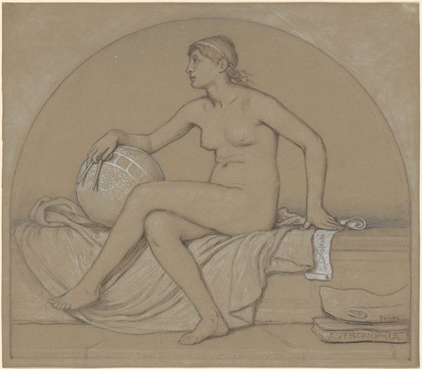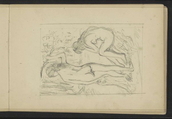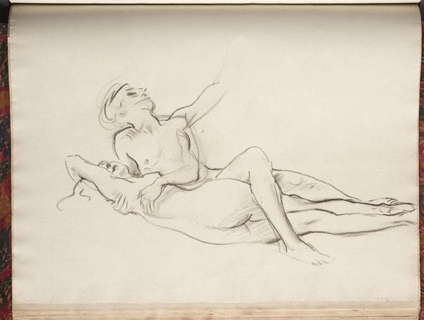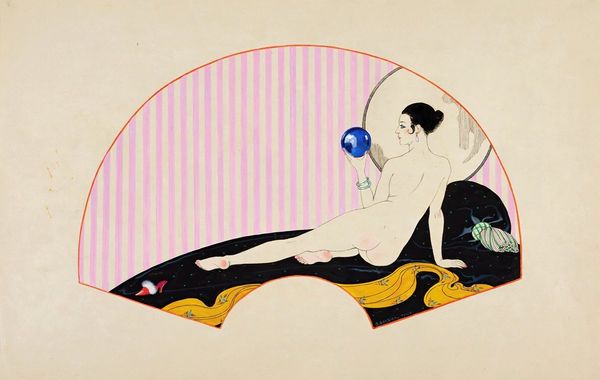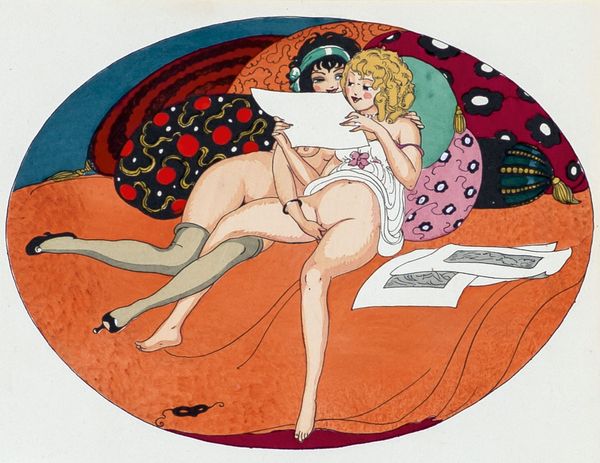 Curator: What a delightful little reverie! This watercolor by Gerda Wegener is entitled "Les Délassements D'Éros," created in 1925. What are your first impressions? Editor: It feels playful and dreamlike. The way she uses the watercolor almost washes out the scene, making it feel less explicit and more like a cheeky daydream. There's definitely a sly humor to it. Curator: Precisely! Wegener had such a wicked sense of humor. She often used mythological imagery to playfully subvert societal expectations around sexuality. That reclining figure, for instance – part man, part goat – that's a faun, right out of classical mythology. The woman looming over him is harder to pin down though. Editor: The grapevines overhead and her pose definitely evoke the imagery of Dionysus and his bacchanalian rituals, although with her hair piled neatly, and an unreadable gaze focused to the skies she doesn’t embody frenzy so much as, say, well…determination. I suppose it hints at desire unbound by mortal restraints. Curator: I read that determination as impatience, even! The title hints at "Eros's Relaxations," but there's such tension in that arched back and her upturned face. It's almost as if she's saying, "Alright, let's get on with it!" which for 1925 feels quite radical. She’s not objectified but very much in charge. Editor: Absolutely. And the fact that it’s rendered in watercolor, so light and airy, takes away any heaviness that the subject matter might imply. She's cleverly using this delicate medium to make a bold statement. It seems, at its core, a clever commentary on gender roles. A nudge at the assumed passivity of women in both art and life. The soft, whimsical style serves as a vehicle to communicate deeper, complex themes about gender, sexuality, and freedom of expression. Curator: And don't forget, Wegener herself lived a life that defied conventions! A reminder that art isn't just about what's on the canvas; it's often a reflection of the artist's own story. Editor: A beautifully succinct point. It invites us to think differently, both about Wegener's time and about our own. A small picture packing quite a punch!
