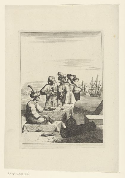 Curator: Immediately, I am struck by the sheer busyness of this composition, a crowded scene that still somehow feels airy and open. Editor: Indeed. What we're looking at here is a print from the Rijksmuseum’s collection entitled "Four Women Dancing Around Four Seated Men, Possibly in China," dating roughly from 1668 to 1725. The piece is an engraving made by an anonymous artist. Curator: China! Well, the presence of the pagoda certainly anchors it. The dance feels ceremonial, celebratory even, and look at how the raised hands create echoes of upward motion, almost reaching towards the stylized clouds above. Is this some sort of harvest festival or a diplomatic event maybe? Editor: It could be, yes. Note how the engraver utilizes relatively thin, controlled lines. This generates an intricate level of detail in their garments, fans, and especially in the subtle textures of the landscape. And consider the significance of a European artist portraying an image of an event they've possibly never seen. Curator: That adds another layer to its symbolic value. The print isn’t necessarily presenting an objective truth; instead, it showcases how the Western world viewed China. Observe, for instance, the depiction of these dancers with wide open arms in this communal gathering, evoking exoticism, reverence, or even perhaps, romanticism. Editor: You are correct. Moreover, what does the inclusion of figures with clearly differentiated roles, active dancers and seated men imply about status and power dynamics? Curator: It adds depth, inviting viewers to consider hierarchy, respect, and perhaps even the gender roles within this interpretation of Chinese society. Editor: Ultimately, analyzing this piece offers us not just an artistic window but one looking at cultural reception. The controlled medium allows for very clear representation. Curator: Agreed, leaving us with lingering impressions about our perceptions of "otherness." Editor: A testament to how even seemingly straightforward depictions carry deep encoding.
