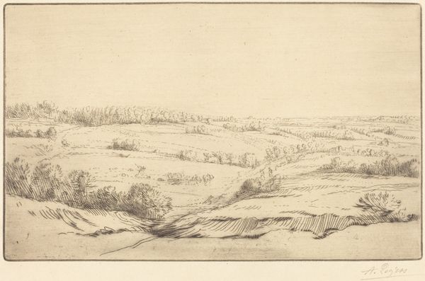 Editor: This is *Waldpartie aus dem Taunus mit dem Försterhaus bei Oberursel* by Friedrich Wilhelm Hirt. It's a drawing with tempera, red-chalk, and pencil, located at the Städel Museum. The hazy, monochromatic texture really lends a dreamlike quality to the landscape. What captures your attention most about this piece? Curator: I see the exploitation of the Taunus landscape. Hirt's choice of readily available and affordable materials like pencil and red chalk speaks to the democratization of art-making and its accessibility within a growing urban middle class, hungry for depictions of leisure outside of industrial spaces. Note the efficient etching technique, replicating images to meet demand. How does the limited palette influence your perception? Editor: It definitely feels grounded and connected to the earth. The lack of vibrant colors makes me think about the cost and availability of pigments. Do you think Hirt consciously considered those limitations while creating the drawing? Curator: Undoubtedly. He understands his audience and market. The scale suggests domestic consumption, art for the burgeoning urban household. Even the visible pencil sketch lines acknowledge the labor, rejecting notions of effortless artistic genius, aligning more closely with craft production and challenging conventional artistic hierarchy. Editor: That makes a lot of sense. Seeing it in terms of production and consumption changes the way I interpret the work's intimacy. Curator: Exactly. It prompts us to reconsider traditional notions of artistry by emphasizing how the creation process can be affected by labor value, accessible media, and also societal context. This really encourages thinking about accessibility in artistic representation. Editor: I never thought of landscape drawing in that way before. Now, it is clear that landscapes weren't simply reflections of nature but deeply intertwined with socio-economic factors. Thank you for this eye-opening discussion! Curator: A valuable exercise! Examining material choices exposes so much about its context and shifts our perspective of this historical piece.
